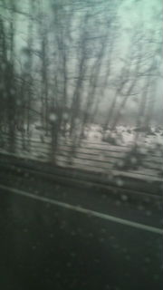 (写真:支笏湖までの道。せっかくの美しい湖もこの天気で何にも見えなかったよ。山道にはまだ雪が残ってて体感温度は下がる一方。車から撮ったのでぶれてるけど。)