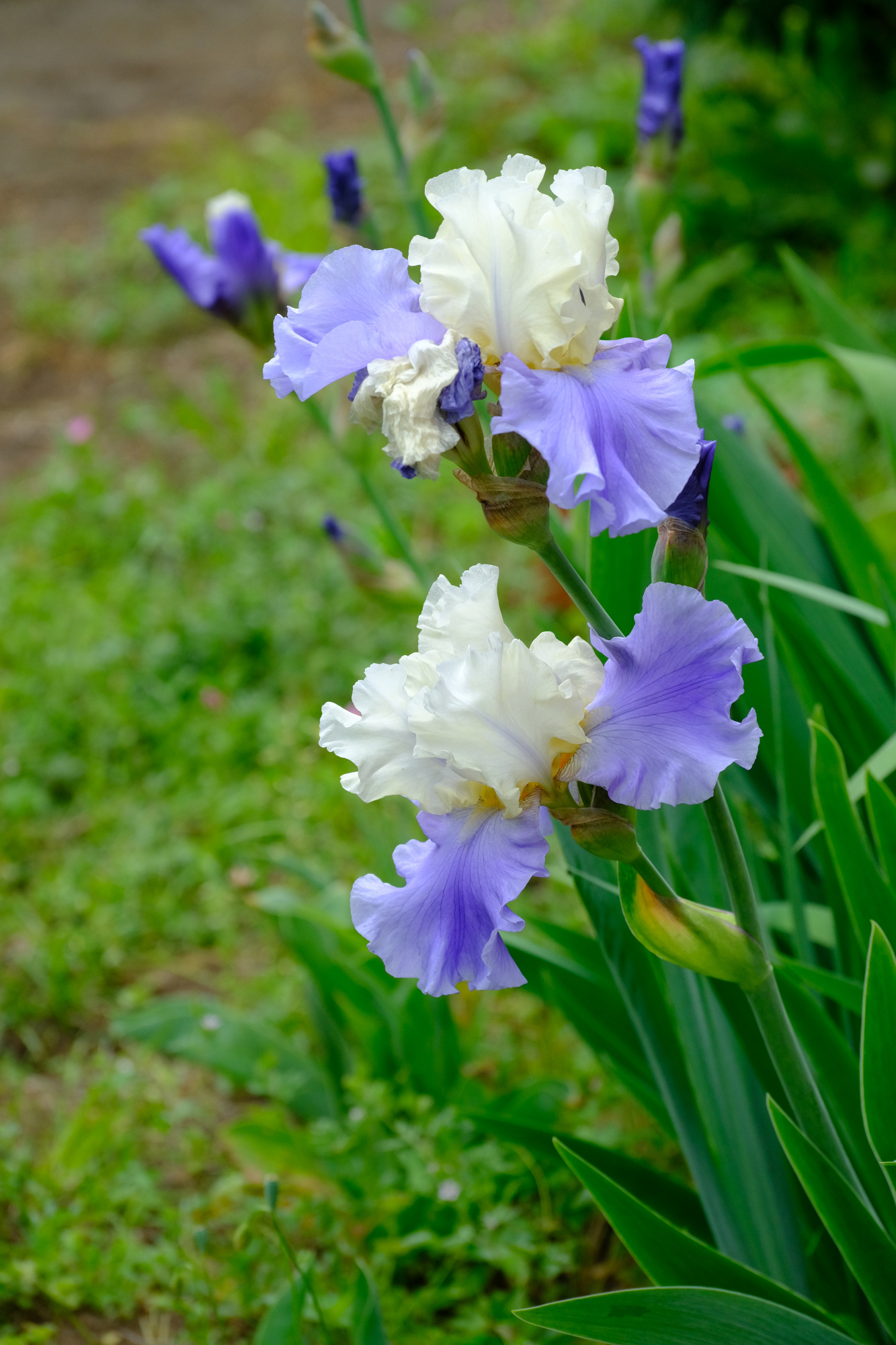 昨日のブログの最後の写真のつぼみが咲いたら、以下のような花になりました。(#^.^#)ジャーマンアイリスですが、特にひらひらしているような気がします。かなり豪華な花が咲き、庭のそこだけが明るくなります。(#^.^#)雨の日も水滴をまとってしっとりと。まだ咲き出したばかりですが、今年はつぼみが多数あるのでたくさん咲くようです。アマドコロも急に出てきて、どんどん背をのばしていました。アマドコロの下にはスズランが。ドイツスズランなのでしょう。これも雨粒をまとって。シラー・カンパニュラータは雨で倒れてしまったので、また晴れた日にでも再登場するかもしれません。('◇')ゞ