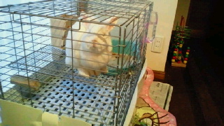 改めて、私とうさぎさんについてのご紹介我が家には3ぴょんのうさぎさんが生活中長男はポコ9才、次男はコロ2歳 長女ろみ もうすぐ2歳ポコちゃんだけしかいなかった時に、ブログでうさ友さんと知り合い、その後ミクシイを始めてうさぎのコミュお友達もでき、里親募集のお手伝いで色々あった末一昨年、コロちゃんが、昨年、ろみちゃんがやってきました。 3うさとなったら、どの子の事を書いたらいいかと思うと、迷います~ ポコちゃんだけの時代が長かったから、写真がいっぱいになり2うさになった時にブログを作り変えたのはいいけど、また1うさ増えてしまいうさぎの関心ない人にとっては、どのうさぎがどうでも、関係ナイなぁと思いながら書いておりますが… 勝手に書き進んでまいります 今日は、ろみちゃん(某小学校で募集されていた時はバニラちゃんでした) もうすぐ2歳になるんですが人懐こいので、人前に出してみました元々学校飼育のうさちゃんで、広い飼育建物の中で自由に走っていたのびのびさんだけあって、好奇心旺盛今年に入りレッスン室の入り口で、生徒や保護者が声をかけると愛想振りまき中 「こんにちは」「ハロー」と言うたびに、頭をペコッと下げ、帰りも「さよなら~」「バイバイ」と言うと、アゴを前に出して、バイバイしているんですよまぁ、気のせいでしょといわれそうだけど 良く見てると人の動きに合わせて自分も反応するのがうさぎさんです おかげさまで、無口な生徒も、真剣に話しかけているみたい 「ねぇ、ろみちゃん、ろみちゃんさぁ…」「そんなに牧草ムシャムシャしてたら、喉かわくですよ」とか 真剣に話している様子は、人間には言えない事をついホロリと言っても受け止めるオーラがあるみたい うさぎさんは偉大かもホラ↓ なんだか、こっちを見ながら、語りかけている感じがしませんか? エッ、あたちの事ですか?ろみより