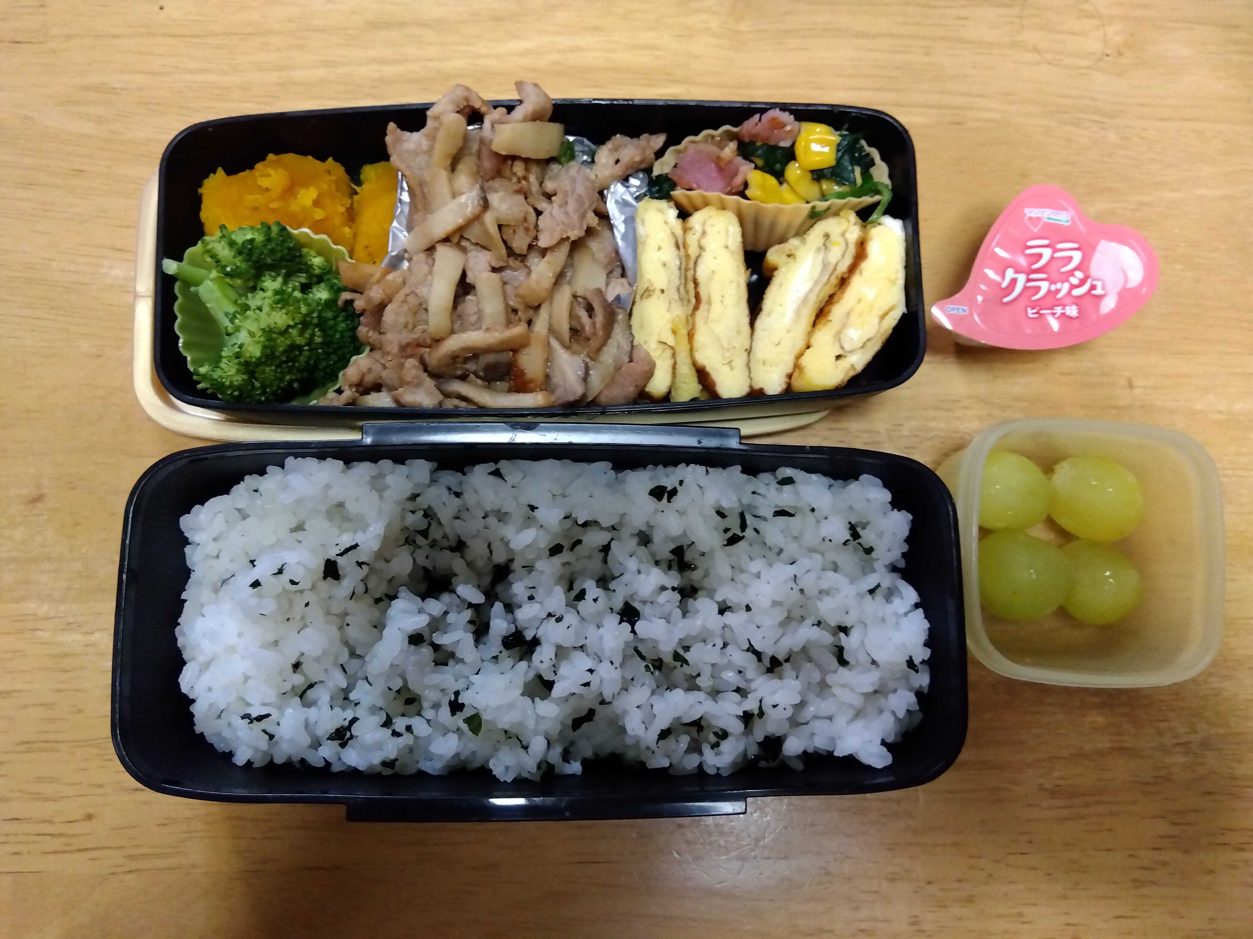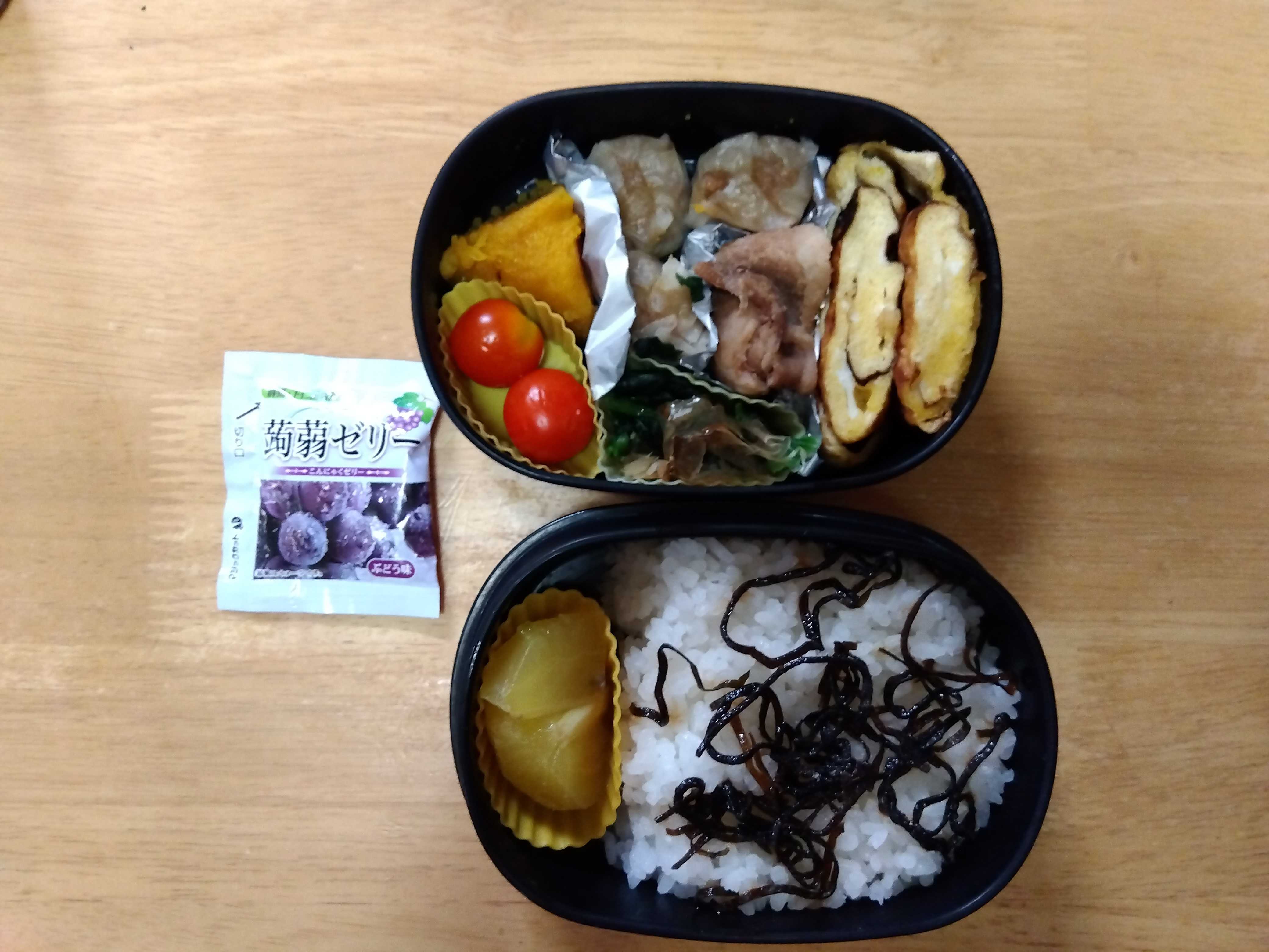 今日は高校1年長女分です。・塩こんぶごはん・たまご焼き・豚のしょうが焼き・しゅうまい(惣菜チルド)・かぼちゃの煮物・ほうれん草のおひたし ・ミニトマト・キウイフルーツ・ゼリー作る気失せたので前日にパンを買って持たせようと思っていたけど雨が降っていたので買い物行く気が失せました。 メニュー考えるの面倒だったので昨日とほぼ同じ。長女が昨日持参しなかったお弁当は私が食べたのですがたまごやきの甘さが控えめすぎたので次回から砂糖の量を増やそうと思いました。長女がスマホの通信会社変えたので、今日は解約した通信回線のシムを返却手続きをします。