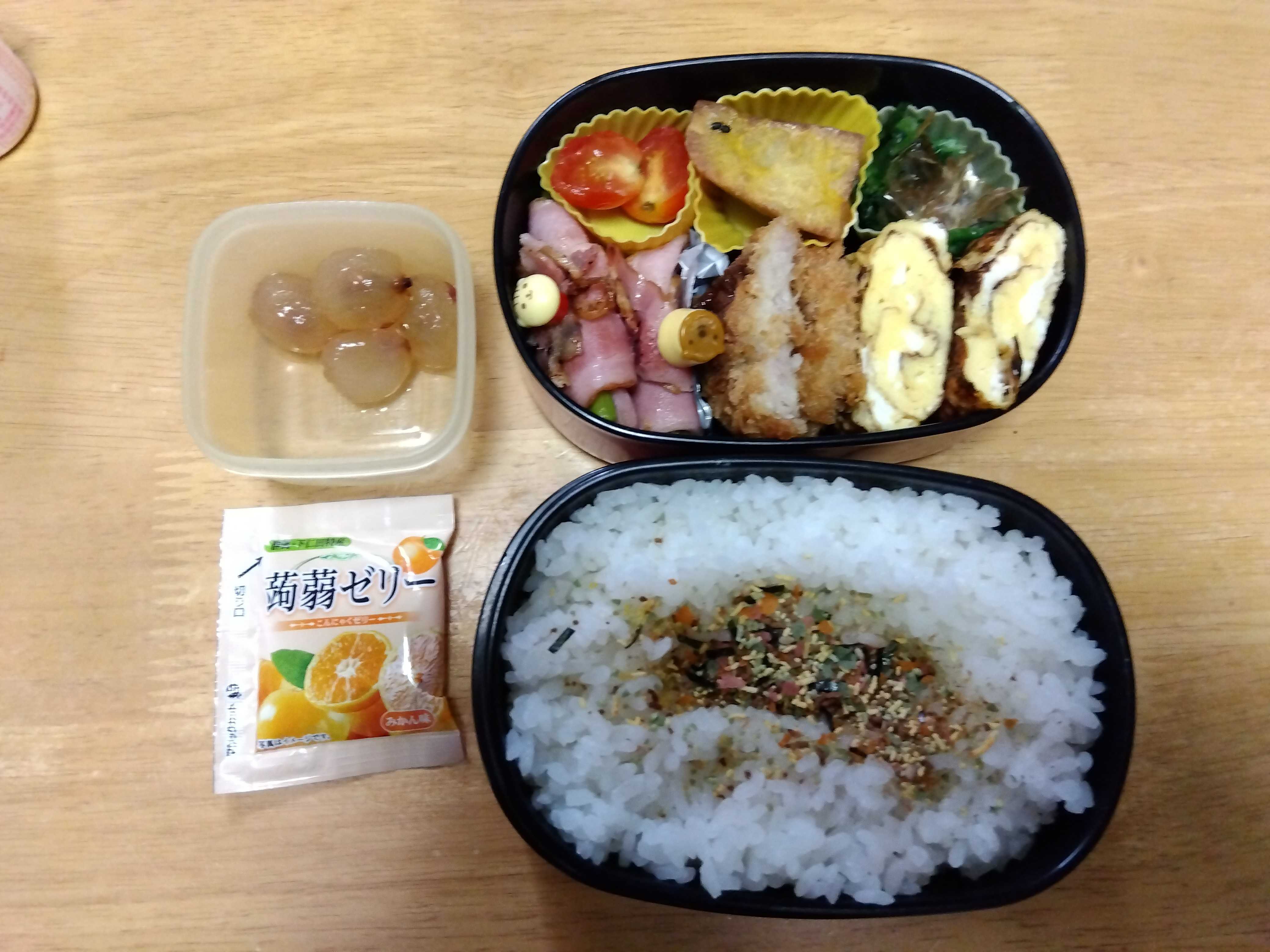 ・ふりかけごはん野菜味・たまごやき・ヒレカツ(スーパー惣菜)・アスパラベーコン巻・ほうれん草のおひたし・大学芋(スーパー惣菜)・ミニトマト・ぶどう・蒟蒻ゼリーぶどうを残してきました。種を口から出すのが恥ずかしいから嫌なのだそうです。次回から種があるものを入れるのは控えようと思います。