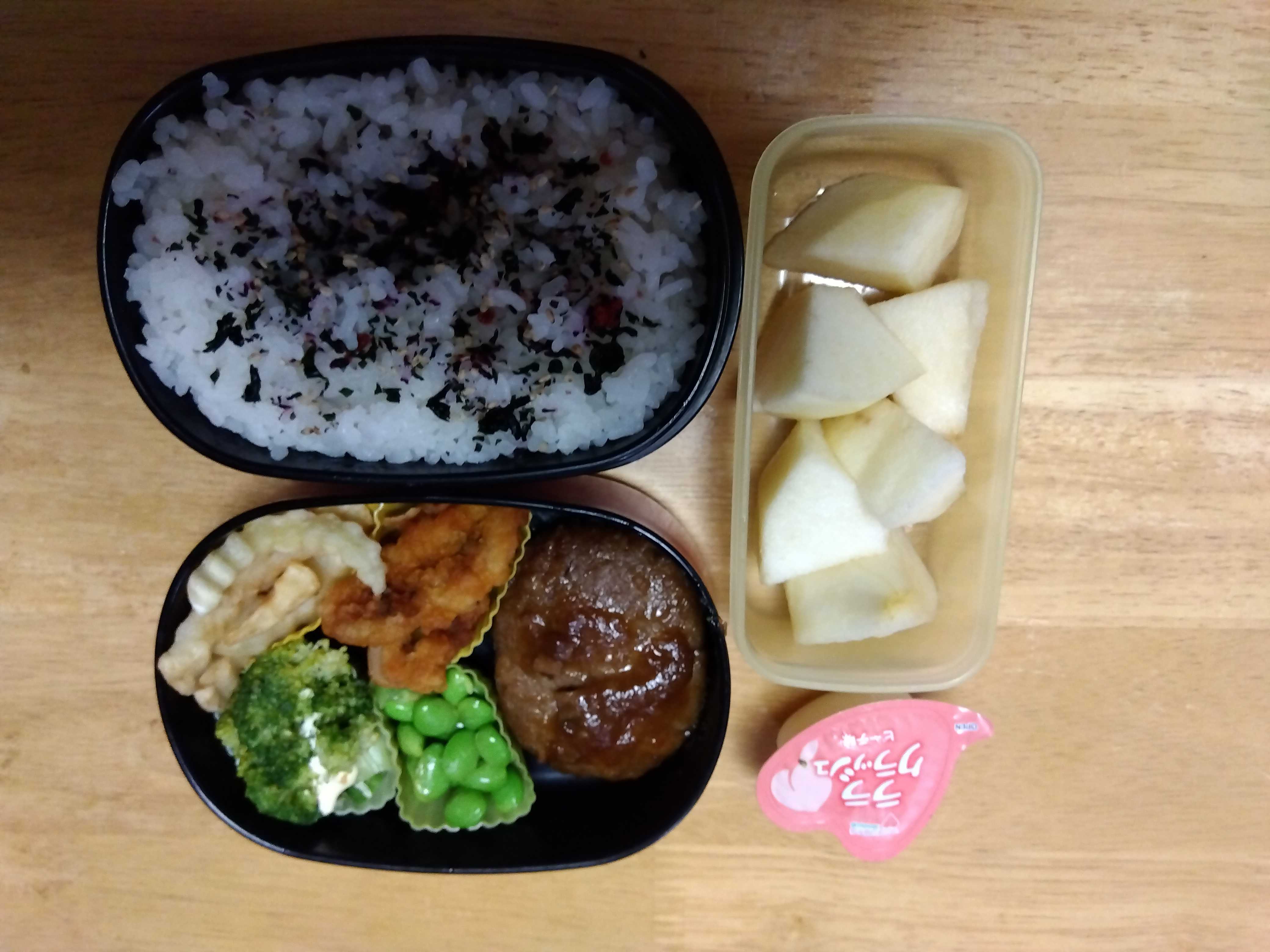 ・まぜこみわかめ梅味ごはん・和風ハンバーグ(冷蔵惣菜)・いかの唐揚げ(スーパー惣菜)・えだまめ(冷凍食品)・ブロッコリー・ポテト(冷凍食品)・りんご高校1年生長女からカボチャの煮付けと大学芋を入れないでと言われました(*_*)偏食なのに同じメニューが続くと食べなくなるので困ります。