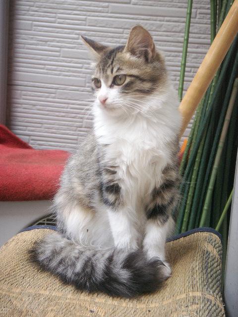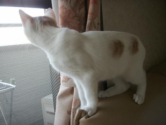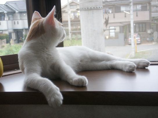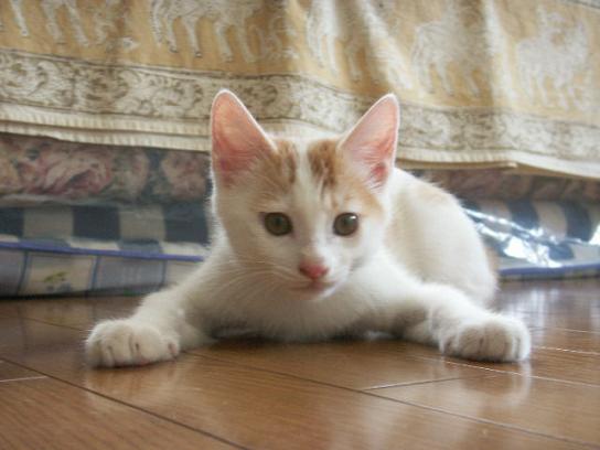 忙しくて日記を書くことまで余裕がなかったのですが少しずつ「あの仔猫ちゃん」との関係は縮まっています(^^♪こちらの写真は約1週間ほど前に撮ったチンチラちゃんです。「チンチラちゃん、おはよう♪」こちらが声を掛けると、甘えた声で「ニャァ」とお返事します。2回のベランダで洗濯物が揺れると・・・「ん??」とばかりに上を見つめるチンチラちゃん。仔猫なのでどんなものにも興味があるようです(*^o^*)現在私の母が一生懸命信頼関係を築いています。チンチラちゃんがお部屋に入れるように居間の掃き出し窓を開けっぱなしにしたりして、慣れさせています。一応、母が遠くで見ていても部屋に入ってくるそうですがちょっと動くとすぐ出て行ってしまうそうです。でも窓の入り口のカーテンで遊んだりしているそうです。***********************************************************そして今朝のチンチラちゃんですこんなに近くで撮らせてくれました(*^▽^*)・・・というより、窓からデジカメをそぉ~っと出してがっつり望遠で接写しました( ̄∇ ̄*)ゞでも以前はちょっと動くとサッと隠れちゃったのに今ではそれほど動じなくなりました。上に写っているゴザでよく爪とぎしたり、遊んでいます。そして立ち上がったので、全身を接写!!パチ /■\_・) カメラ 美人でしょ??この子、女の子でした!!おっ!!また体制を変えた!!ずいぶんとリラックスしてますね(^▽^;)*************************************************************そして今日・・・・もしかして、この仔猫ちゃんの里親さんが見付かるかもしれないというビッグニュースが飛び込んできましたヽ(*⌒∇^)ノヤッホーイ♪「猫好き」な近所の知り合いの方が急きょ名乗り出て下さいました!元々そちらのお宅にも室内飼いの猫ちゃんがいて娘さんが白い猫ちゃんを飼いたいと思っていたところだったそうです。たまたまうちの前を通りかかったその知り合いの方が母から仔猫の話を聞き、娘さんと旦那さんにお話を持って行くと言ってくれたそうです。旦那さんも室内飼いの猫が1匹増えることは歓迎してくださってるそうであとは娘さんと奥様が気に入ってくれれば話がまとまりそうです。この子の写真も欲しがっていて、早速プリントして母親が渡しに行きました。ちょっとドキドキしてきました((((o゜▽゜)o))) ドキドキ♪結構急展開なので、いまいち実感が沸きませんがあの子に暖かいお家が出来ると思うと嬉しいなぁ(*ノ-;*)良いお返事がくることを祈ります・・・今日もレオのバカ話はお休みです(≧∇≦ )
