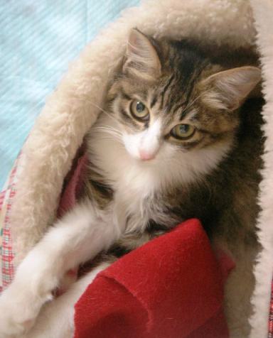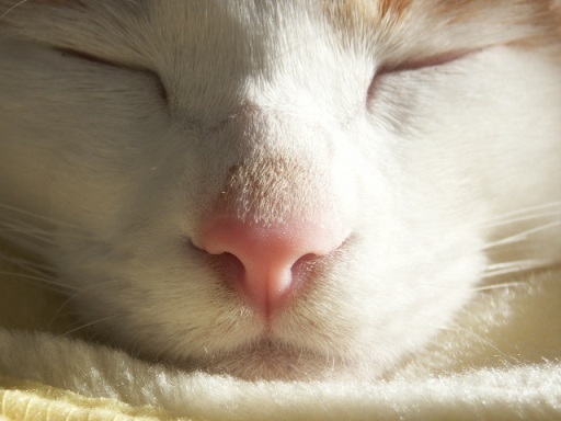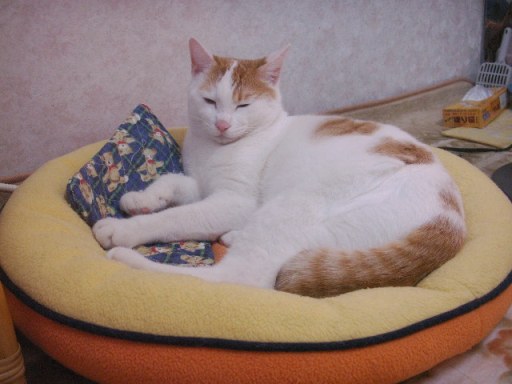 今日はレオがそろそろ3ヵ月になるのでワクチン注射に行って来ました。レオちゃん、飯食ってる場合じゃないですよかねてから気になっているレオの鼻周りの黒い部分も相談してみました。・・・ (・Θ・;)汚れだったのね (* ̄□ ̄*;汚れだとさ!レオは男の子のなので「白・茶」の柄がカラダにはっきり出ているのでこれで「黒」があれば、貴重なオスの三毛猫!先生も若干ワクワクしてましたが、「これは汚れですね」ということでした。猫は肉球部分の毛に、持っている毛色が出るそうです。レオはクリーム色しかありませんでしたっ!無事、注射も終えて帰途に着きました。その後レオはこんなにちんまりと、くるくるにカラダを丸めて寝てました本当はいつもはこんな感じです今日は注射したので、レオちゃん安静にね・・・と言ってもウメとミィちゃんとまたバタバタ大運動会始まるかな??