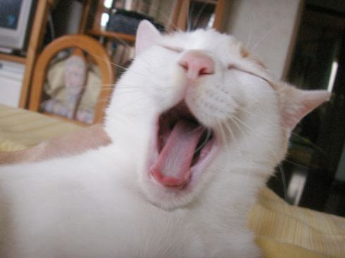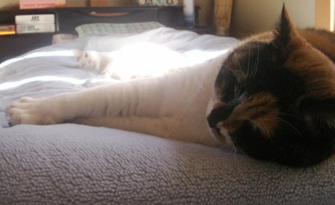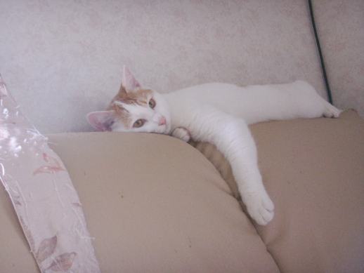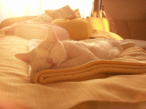わたくしごとですが・・・また風邪ひきました先月に続き2度目です。そしてレオにまた看病されました姉ちゃん、だいじょうぶ??(手前のボロ布はカーテンのタッセルです(・Θ・;)…)ほんとうに、今回はレオに看病されまくりでした。レオも2回目の看病とあって?手慣れたものです。ベットで寝るときは常に一緒に添い寝です。あっ、起きたの?おはよ。起きたらこんな感じで添い寝されてます(携帯から撮りました)よっ!具合どう??( ̄- ̄)わたし: 「まぁまぁいい感じです」あっ、そう。じゃぁ寝るから、おやすみ・・・( ̄ー ̄; わたし: 「おやすみなさいまし~・・・」ねっ??レオったら手慣れたもんでしょ??そりゃぁそうだよ、もう2回も面倒見ているんだもん!( ̄- ̄)わたし: 「・・・どうもいつもすいませんねぇ。」今回もレオは「添い寝、肉球をわたしのお顔にぴとっとあてる、お顔をなめる」といっぱい看病してくれました♪れおたん、どうもありがとう!おかげで元気になったよ!もう、風邪ひくなよ!(^^)/わたし :「はーいレオ先生」