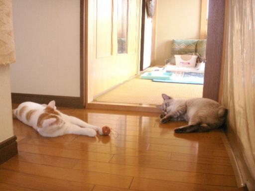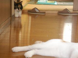 子供って本当に「怪我」がツキモノですね(>o<")そうなんです、またレオが怪我をしてしまいまして・・・元気でやんちゃ坊主o(^・x・^)o ゆえなんですけどねいつものように朝ご飯をもらった2階の住人の3匹は大運動会を開催します。大運動会後の2匹↓走りすぎて崩れ落ちるレオ、涼しい顔で見つめるミィちゃんいつもの風景なので、ワタシも自分の朝ご飯を食べに1階の居間に降りました。それは私の朝食後に起こりました。ご飯を食べ終わり、2階にある自室に戻ろうと階段を4,5段登ったところで白い物体がものすごい勢いで落ちてきた!!と思ったと同時に「あっレオが落ちた!!」と、すぐに分かりました。レオは落ちてビックリして玄関の下駄箱の下に隠れていましたレオを抱き上げて、関節や前後の足や体などをチェックしましたが特に痛がったりする様子は見られなかったので、ホッとしました。でも、後ろ足のスネ?のところの毛が縦に1センチ程抜けてチョット血がにじんでしまっていました。たぶん落下途中に何かのカドに引っかかってしまったみたいです。2階の廊下の踊り場はちょっとした吹き抜けになっていて2階の廊下の吹き抜けから、下へ降りる階段を見下ろせるようなつくりでよくレオやウメが吹き抜けの幅約20センチ程の手すり状のスペースから見下ろしていたり歩いているので、見ているこちらがヒヤヒヤしていました。いつもレオとウメが朝からその吹き抜けで遊んでいるのですが今日はレオがその吹き抜けの手すり状のスペースに飛び乗った時に勢い余って落ちてしまったみたいです。ボクはチョット怪我したけど、ダイジョウブだよd(=^‥^=)b 毎度お騒がせいたします(●´ω`●)ゞエヘヘ