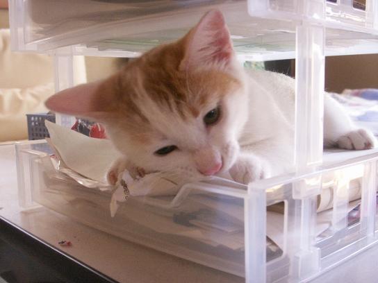 うめちゃんが戻って来てから明日で1週間になります。毎日が運動会のような慌しさで楽しいです。幸いミィちゃんがおりこうな猫みたいなので、流血するような相性の悪さは今のところ3匹感じられません。ミィちゃんはレオの保護者で、レオは猫同士のフィーリング等は一切関係なくミィちゃんやウメにくっ付いて歩いて、後ろからチョッカイ出したりして遊んでます。やはりまだ子供なので、2匹とも怒ったりしませんね。レオがウメのエサを横から横取りして食べ始めたらしいのですが、ウメは怒るでもなく「あら、どうぞ」みたいにレオに譲って食べさせたそうです。レオは役得だね!イタズラばっかりしてる子、だぁ~れ??↑↑↑この写真のレオ、どんなイタズラをしているかわかりますか??父親の部屋にあるレターケースの引き出しに入っちゃっているんです。そして紙を噛みちぎっています。キミは事務員さんにはなれませんね!ウメ:「あの子何やってるのかしら?かかわらないでおこうっと!!」レオ:「うわ~ん!!ウメちゃんに無視されたよぉ~」この写真には写っておりませんが、この近くにミィちゃんもくつろいで座っています。何気に3匹ともお互いを受け入れているような空気は、今日感じました。話が変わりますが、わたし、猫が笑うのを初めて見ましたニャハ~~~ン「ニャハ~ン」って・・・