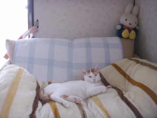 久しぶりに晴れやかな日になりましたね(・-・*)♪こんなまったりした日はネコたちは日向ぼっこでスヤスヤ(_ _).。o○ひさしぶりのウメちゃんいつもウメは私の部屋では寝ないので、こんな風に私のベッドで寝るのは珍しい。父の部屋の押入れかコタツで寝ているので、あまり写真も撮れないんで。。。たまにフラフラ廊下を歩いていても、カメラ向けるとo(=・ェ・=o)=3=3=3=3=3=3猛ダッシュで逃げて行ってしまうので、最近写真も撮ってなかった(;´▽`A``そしてコイツ↓↓↓なんちゅ~カッコで寝ているのでしょうか。。。ヒドイ寝相ですレオさん!この子は本当に自分を猫さんだと思っていないと思います。夜は決まって一緒に寝るのですが、寒いから布団に入ってくるとかではなくベッドでくつろいでいるワタシが何となく、視線を感じて下を見やると・・・レオがじーっとワタシを見ている・・・ レオ⇒ (^・o・^)ノ 「そろそろベッドでボク寝たい」私⇒ ( ̄- ̄) 「ハイハイ。。。気付きませんで、スイマセンでした」レオ、ノソノソと人の枕を奪ってクルクルっとカラダを丸めて・・・レオ⇒ ~(=^‥^)ノ☆ 「姉ちゃん、おやすみニャ。」レオ⇒ (ΘωΘ)o.。o○グー毎晩こんなやり取りです。(どんなやり取り?)レオはワタシがベットでくつろぎモードになると、どこからともなく現れます。フッと「誰かに見られているっ!」と思い部屋を見渡すと、下からレオがじーっと見上げています。こういう時は「ボクもそろそろ一緒にベッドで寝たいの♪」という合図なので、呼び寄せると私の寝ている枕のど真ん中に落ち着きます。そしてレオ爆睡。。。朝まで寝てます。そしてわたしが起きても、起きてこない図々しさ!!この睡眠パターンになってから、何度もレオに顔を足蹴りされて夜中に起きます。今日は明け方に、どうやら私の足元の方の毛布に潜り込んだらしくチョットわたしが足の位置を変えたら「ウギャァ!!」じゃれていると思ったらしく、レオに足を噛み付かれました。。。Σ(´□`;)痛いよぉ!ゆっくり寝かせて頂きたいのですが。。。(*Θ_Θ*)ダメですか??