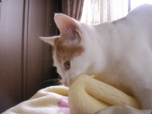 年末に差し迫り、私も仕事に忙殺される毎日になってきました。いよいよ、ニャンコ達とも戯れる時間もここにきて限られるようになってしまいました(ノ△・。)そして3日前「あること」をきっかけにレオが今日、病院に行くことが決まりました。「あること」とは・・・去勢手術を受けることです。レオも今月末で7ヶ月になり、そろそろ「スプレー」もはじまるかもしれないと思っていました。なぜ、急に決まったかというと・・・3日前、私が仕事から帰宅後母が「今日のレオ、いつもと様子が違ったよ」と言ってきた。どうやら人間でいう「思春期のとまどい」を感じているのではないか??と。何故母がそう思ったかというと以前の日記でもご紹介したようにレオは黄色いプーサンのひざ掛け毛布を見ると一目散に飛んできて、「フ~ンフ~ン♪」と鼻を鳴らし、こんな感じで↓↓ひざ掛け毛布をくわえ、どこかへ行ってしまう・・・この状態で、廊下をズルズルと毛布をくわえたまま、「フ~ンフ~ン♪」とひきずって行きます。そして毛布を取ろうとしたり、レオを触ろうと近づいたりすると異常なほど警戒し、目もイっちゃってます。その日は1日中そういう状態で、普通のときでもやたらと警戒しておかしかったそうです。そして廊下に水しぶきのようなモノが垂れており母はそれが「スプレー」かもと思って、慌てて獣医さんに電話していきさつを話しレオを連れて来て、タマタマの発達具合をチェックし場合によっては去勢手術をする、ということになりました。そして獣医さんに行くことが決まった矢先レオの目の周りのピンク色のフチの皮膚がかなりなピンク色になっており、目やにがいつもより多く黄色っぽいことに気づきました。ちょうど3日後に病院に行くことに決まっていたので、ついでにこちらの症状も見てもらおうということになりました。結果・・・・レオのタマタマの発達は小さいながらも手術OKな大きさでした。ちなみにレオは4,4kgになったのですが、カラダの割にはタマタマが小さいのでオスの野良猫ちゃんのような立派なタマタマではないのであまり色々な意味で強くないそうです。手術は22日に行うことになりました。やっぱり、とっても心配です・・・目の方は、白猫ちゃん特有のもので心配ないそう。白猫ちゃんは瞳の色素が薄いので、よくあることだそうです。今日は点眼してもらいました。その点眼でひとつ、気になる症状を獣医さんが教えてくれました。点眼の際にレオの首根っこを、点眼しやすく引っ張って差していた時「レオちゃんは将来歯周病になりますね」とおっしゃいました。「今も少し口臭あるでしょ?」と聞かれたので、「はい、舐められると臭いと思います」と・・・口臭のある子は長寿の猫ちゃんより、短命になることが多いそうです。Σ(゜□゜;)ガーン(。□。;)ガーン(;゜□゜)ガーン!!レオの歯茎と歯の境目がちょっと赤くなっているのですがそれが口臭の子に多い特徴で、持って生まれたものだそうです。ちなみにウメもこの症状です。単純に口に雑菌が繁殖している場合と腎臓に疾患があるか、糖尿病とも関係があるそうです。(´;ェ;`)ウゥ・・・切ないです。。。レオは今も目をシャパシャパして、煩わしそうですやっと私の風邪が治り、元気いっぱい遊べると思ったのに今度はレオが去勢手術に、目の不調・・・・早くこのイヤな流れが断ち切れますように・・・レオたん、お目め早くよくなるようにお祈りするからね♪