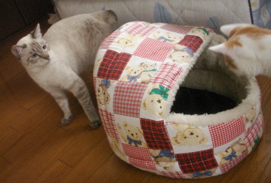 昨日の風景久しぶりに2匹の2ショットd(=^‥^=)b ニャッ!これは何をしているのかというと、中央のドーム付きベットを帰ってくるあの子ためにケージをセッティングしている時の様子です。普段は使ってもいなかった2匹なのに、チンチラちゃんのためにこのベットを準備していたら2匹で取り合いをしていました。↓レオが入り・・・ ↑ウメが入る今までは見向きもしなかったくせに・・・(-_-;)昔はこんなだったのに・・・キャァーo(´○`)o ♪カワイイ・・・レオたん♪ラブ(*-ェ-(-ェ-*)ラブ♪***************************************************************そして、チンチラちゃんが動物病院にいた3日間のあいだ近所の方でもう1人里親候補の方が見付かりました♪野良ちゃんの保護活動をされている、お向かいの母のお友達が「白い仔猫を飼い猫として捜している」という近所の方にこのチンチラちゃんの写真を持参して、交渉に行ってくれていました。この写真も持って行ってもらいました、だってメチャかわいいんだもん・・・そして途中報告が入りまして「娘さんと息子さんがとっても気に入って、今すぐにでも飼いたい!」と前向きでとっても好感触!あとはお父さんの許可を得れば決まりそうだということでした。こちらのお宅もすでに1匹猫を室内飼いしているのでそれほど引渡しについては不安ではないです。おうちも我が家から近いので、ちょっと姿も見れそうだし・・・もしも里親候補の方からダメ出しが出ても次は我が家の5匹目の猫家族に迎え入れるつもりです。というか密かに母娘で「我が家で飼いたい・・・」と思っている今日この頃です(;´▽`A``だってかわいいんだもん(=´∇`=)にゃんうちでは「ヒメちゃん」と呼んでます♪今はこんな感じです☆ちゃんと「レオ&ウメ」で取り合ったベットでねんね♪いや~ん、のぞかないで!!レオたん、イジメちゃだめだよ!!今日、里親候補の方から最終報告が来ます・・・ドキドキ(・Θ・;)…