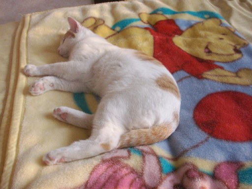 やっと風邪から解放されそうです(= ̄▽ ̄=)V こんなに風邪を居座らした、ワタシがいけないのですがとっても今回は懲りました・・・(x_x;)やっぱり風邪のひき始めから、医者にかかること!!皆様もお気をつけ下さいね(^o^)/=========================================というわけで、久々に休みらしい日を満喫しました!健康って素晴らしい!(ノ^∇^)ノところでところで\(-_\)(/_-)/ ...先日ショッキングなレオの行動に出くわしました( ̄□||||!!このホノボノした寝姿から想像を絶する光景が・・・レオはこのプーさんのブランケットで寝るのが結構好きです。でも最近、それだけが「好きな理由」ではないことがわかりました。それを目撃したのは2,3週間前と2,3日前の2回あります。私がこのプーさんブランケットを寒かったので足に掛けながらテレビを見ている時に起こりました。私がブランケットを掛けたまま、足のつま先を動かした途端♪ニャーニャー o(^‥^=o)~ o(=^‥^=)o ~(o=^‥^)o ニャーニャーすごい勢いで飛んできて、私の動かしていたつま先目掛けて飛び乗って来ました。何やら変な甘い声を出し・・・=( ̄□ ̄;)⇒・・・・・・レオ、腰振ってる・・・・・・ヾ(≧へ≦)〃Ψ(`∀´)Ψ 違う、きっと違うよ・・・.....(((((ヾ( o=^・ェ・)o クネクネ・・・Σ(T▽T;) 神様・・・ 紛れもないレオの腰振りデビューを目撃してしまいました・・・(ノ_< ;)「レオ、オトコ♂になる」(Ψ▽Ψ*)イヤン♪レオ、キミもついに一人前♪(チョビヒゲもないっ!)そろそろ去勢する時期が近づいてきた予感です。立派に育ってきた証拠だねでもやっぱりあの「腰振り」はナマナマしくてワタシにはショッキング(*ノωノ)