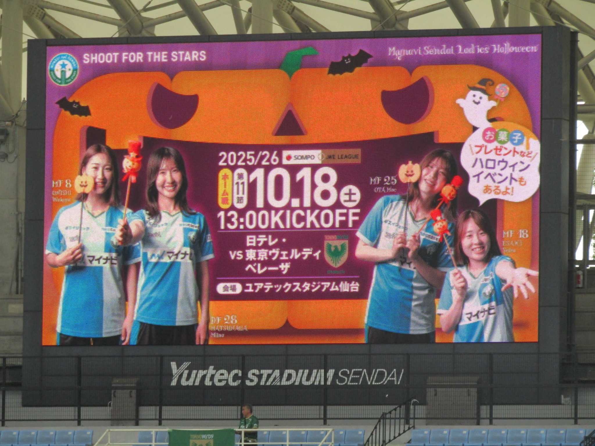 ホームユアスタに昨季リーグ優勝の日テレ・東京ヴェルディベレーザを迎えた。試合前にはTan.San.Sui.とBREAQQQLのLIVEが開催され、コスプレイヤーがユアスタに来場しました。 篠田新社長挨拶。 ◎ 仙台 2-1 日テレ 公式記録 前半10分にパスワークで崩されて失点し前半を0-1で終えた。後半に入り51分江崎のシュートがクロスバー直撃。跳ね返りをU-19津田選手がヘッドで押し込み1-1の同点に追い着いた。午後1時キックオフでしたがスタジアムに照明が点灯されました。 83分遠藤選手の左クロスに途中出場の大西選手が難しい態勢からゴールを奪い2-1と逆転した。大西選手に取って今季初ゴールで前回ホームノジマ戦で途中出場からの交代と屈辱の涙を流しての逆転ゴールで嬉しさを爆発させた。アディショナルタイムに日テレMF猶本選手のFKが一番怖いシーンでしたがマイナビ選手全員で守り大西選手の決勝ゴールで日テレに昨季に続いて2-1で勝利しました。 昨季まで仙台に在籍した隅田選手が挨拶に来てくれました。 次節はリーグ戦も一週間休みで平日の27日アウェー長野UスタジアムでAC長野パルセイロ・レディースとのクラシエカップ戦に挑む。キックオフは12:00。