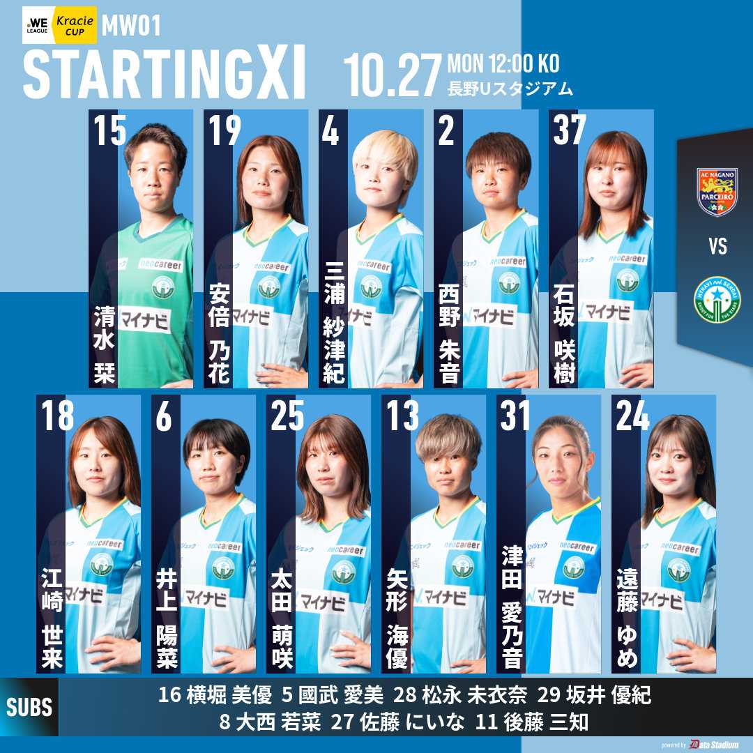 代表戦の関係で今週はクラシエカップ初戦。仙台はアウェー長野UスタジアムでのAC長野パルセイロ・レディース戦に挑んだ。◎ 仙台 2-1 長野 公式記録 長野市の小・中学生の課外授業の一環で27日(月)と平日開催でスタジアムには4,264人が集まった。前半10分に石坂選手のゴールで仙台が先制した。 61分にも遠藤選手のゴールで追加点を挙げ2-0とした。85分に失点するが仙台が2-1でユース出身の2ゴールでクラシエカップ初戦を制した。 第2戦は11月30日ホームユアスタに ジェフユナイテッド市原・千葉レディースを迎えて対戦する。キックオフは14:00。次節11月3日(月・祝)にホームユアスタにアルビレックス新潟レディースを迎えてのリーグ再開戦。キックオフは14:00。