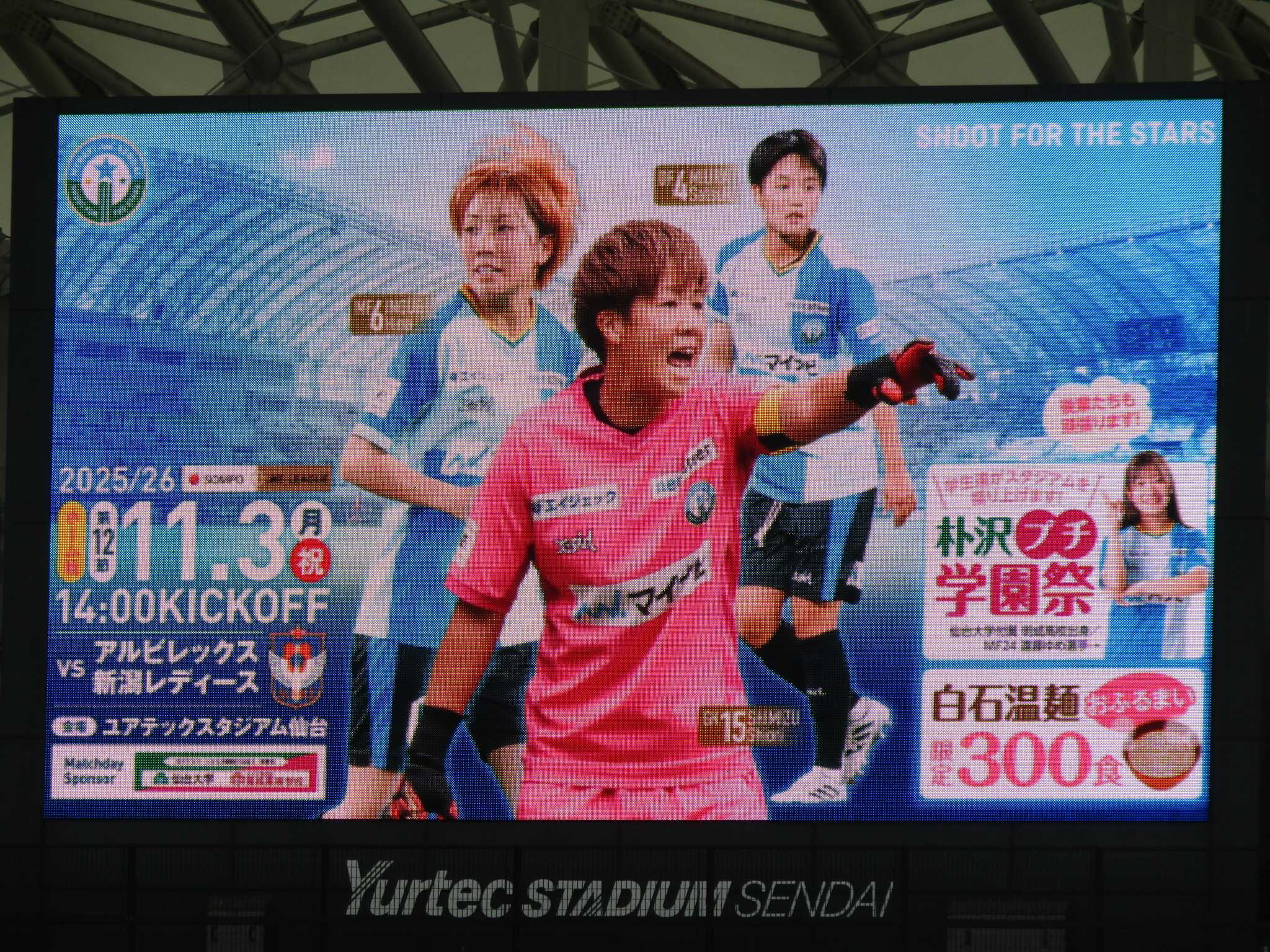 今節ホームユアスタに前季一度も勝てなかったアルビレックス新潟レディースを迎えた。仙台大学附属 明成高校 各学科のみなさんがブース出展や入場口での対応など学校挙げてのスタジアムボランティア体験活動。 白石温麺ふるまいでは、市長自ら白石温麺を売り込みしていました。 試合前にはユース・ジュニアユース報告会が有り、残す試合は両チームとも全国大会とユースは東北代表で皇后杯を残すのみと成った。◎ 仙台 2-1 新潟 公式記録 新潟にはベテランのFW川澄選手、MF上尾野辺選手、元仙台のMF川村選手、DF有吉選手、そして現役なでしこで常盤木出身のMF滝川選手と総々たるメンバーが揃っていて逆に平均年齢は高くなっていました。対するマイナビはユース出身の選手が多く平均年齢も若く元気です。試合開始から仙台が押し込む時間帯が多く津田選手のシュートはクロスバー直撃。前半終了間際の45分に井上選手のパスから相手守備陣の裏を取った矢形選手の技ありループシュートが決まり前半を1-0で後半へ折り返した。ハーフタイムには明成高校ダンス部と一緒にダンスフェスティバルが披露されました。 後半に入り攻撃の手を緩めず攻撃を仕掛け、89分に石坂選手のFKが直接ゴールネットを揺らし2-0とした。 アディショナルタイムに遠藤選手が足を攣り数的不利の中で90+1分に失点するも2-1で前期に続き苦手新潟に連勝し、5勝5分2敗の勝ち点20で神戸、浦和、日テレに続き4位に浮上しました。 次節8日(土)アウェーエディオンピースウイング広島で5位サンフレッチェ広島レジーナ戦に挑む。キックオフは14:00。
