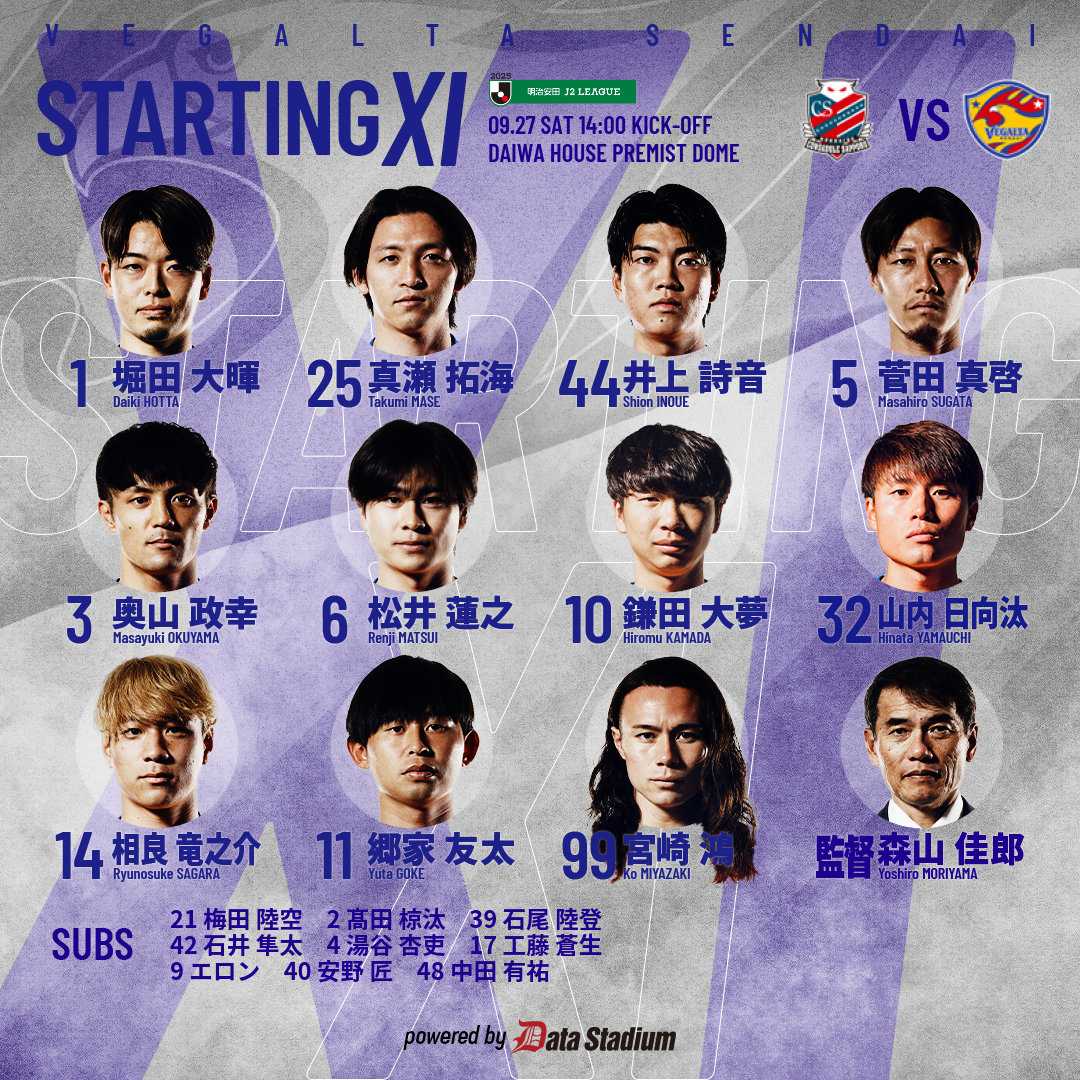 ベガルタはアウェー大和ハウスプレミストドームで今季J1降格の北海道コンサドーレ札幌戦に挑んだ。◎ 仙台 3-0 札幌 公式記録 前節山形戦に続きゴールを守るのは堀田、久々のドームでの試合でした。前半39分に相手の裏を取った相良のゴールで先制した。 前半終了間際の45+3分、山内の芸術的なFKが直接決まり前半を2-0で後半へ折り返した。更に後半に入っても攻撃を緩めず83分に途中出場の石尾のダメ押しゴールで札幌に3-0の完封勝ち。鎌田のラストパスで既に勝負が決まっていました。 次節10月4日(土)ホームユアスタに上位大宮を迎えての直接対決。キックオフは15:00。