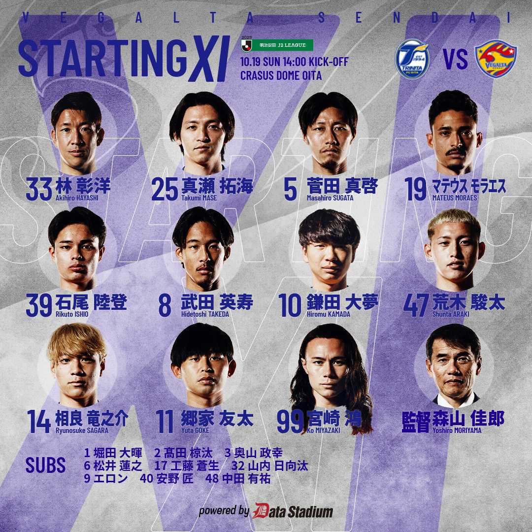 ベガルタはアウェークラサスドーム大分での大分トリニータ戦に挑んだ。◎ 仙台 0-0 大分 公式記録アウェー大分戦に挑み、56分大分FWグレイソンの一発退場で数的有利に成りながらも逆に守備を固められ崩せずに0-0のスコアレスドローで試合終了。昇格争いのチームが軒並み勝利して勝ち点を積み上げる中で仙台は勝ち点1のみと足踏み状態でプレーオフ圏外となった。次節鳥栖に勝利してプレーオフ圏内に戻すのみ。 次節26日(日)ホームユアスタにサガン鳥栖を迎えての直接対決。キックオフは14:00。