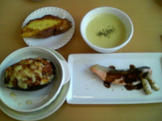 昨日、料理教室に行ってきました。私の料理教室歴は2年9ヶ月。その間、トタールで1年ぐらい通わなかった時期もありますが・・・いまだに辞める事無く、一番長く続けている習い事です。昨日は、約1ヶ月振りに行ってきました。メニューは・・・1:米ナスのミートグラタン2:秋鮭のバルサミコソース3:さつまいものポタージュ4:フレンチトースト~メイプルシロップソース~携帯で撮った画像なのでボヤボヤしていますが・・・米ナスを器にしてミートグラタンを詰めましたどんな料理法でもナスは大好きなので・・・これが、今回の一番美味しかった物です・・・でも・・・ナスを器にした料理は家では作らないんだろうなぁ・・・みなさんは、料理教室で作った料理は家で作ったりしていますか?私は・・・家ではまったく作らないので・・・料理教室の成果はどうなのか・・・一応切る作業は習い始める前よりも、早くなったとは思いますが・・・まだまだ愛しのダーリンに食べてもらった事はありませんが・・・まだ見ぬ誰かを妄想しながら・・・これからも頑張っていきたいと思います
