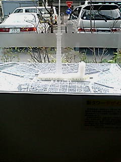 某、墨田区役所に行ったら、新東京タワーの模型があった。思わず写メ。実際に建設する区画を知っているが、そこに入りきるのかなってかんじ。まぁ、出来上がりが楽しみ。