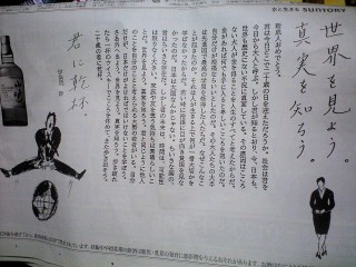 ◆世界を見よう。真実を知ろう。新成人おめでとう。君は今日どこで二十歳の日を迎えただろうか。社会は君を今日から大人と呼ぶ。しかし君が知るとおり、今、日本も、世界も歴史にない不況に直面している。その原因はこころない大人が金を得ることを人生のすべてと考えたからだ。金があれば何でも手に入ると卑しい心を抱いたのだ。自分だけが裕福ならいいとしたのだ。その大人たちの大半は先進国で最高の学問を修得した人たちだ。なぜこんなことが起きたのか。それは人が生きる上で何が一番大切かを学ばなかったからだ。若い時に裕福に目が向き貧困を見なかったのだ。日本は大国なんかじゃない。小さな国の君は小さな存在だ。しかし君の未来は、時間は、可能性は限りなく大きい。家族や友を思う気持ちは素晴らしいことだ。世界を見よう。真実を知ろう。君と同じように他人のことを自分のことと考えられる大勢の若者がいる。自分だけが、日本だけがよければではいけないことを学ぼう。さあ外へ出よう。世界を見よう。真実を見よう。歩き疲れたら一杯のウイスキーでこころを休めて、また歩き出そう。二十歳の君に乾杯。君に乾杯。◆今朝の読売のSUNTORYの広告伊集院静が新成人へのメッセージを載せていた。いつも思うけど SUNTORYの広告はなかなか素敵である。「君と同じように他人のことを自分のことと考えられる大勢の若者がいる。 自分だけが、日本だけがよければではいけないことを学ぼう。」なんて一文を「あなたと同じように他人の事を自分の事と考えてはいない大勢の大人がいる。 自分さえよければと考えている大半の大人で今の社会はつくられている。」◆なぁんて げんなりもする。人が生きる上で何が一番大切なんだろうね。【大人たばこ養成講座】の14.ねじれた国かもしれないけれど、 大人の道は一本道でございますから それを邁進すること。にも やんわりうけた。2009年の成人式でございます件の定額給付金だけど、あたしとしては『貰いたかない』な意見であ~る。バカがくれる ばらまくお金なら貰っておこかと最初は思ったけれど去年末にかけてから、景気の下降度の速度が速い。勢いつぃてる時はその方向に転がっていってしまぅものだし(祖父ちゃんの会社も父さん伯父さん従弟も倒産したしなぁ)うちにとっては、一万数千円なんて そんでも微々たるお金で無駄に遣おと思や、んなもんあぶく銭ですぐ消える。(旅行もなかなかできなぃよなしがない家庭ですが)しかーーし、かかし、まとまった額は 何かを動かせる額ではある。(皆さんご存じ)みながみな 社会のために『辞退します』二兆円あれば何ができる。これからまだ当分先行き見通しが見えないうちの息子の世代とか蓄えも余裕もない身体壊したらこれからどぉすんだよ。な、うちの親の世代とか泣いている製造業や雇用問題、仕事も住まいもない人達や年金も安心できないよな社会保障。これから社会を担う子供を産み育てる世代が子供を産みたくても育てられないどころか病院さぇ見つからない病院が見つからなくて たらぃまわしそんで たかが1万2千円あたしが貰ってどする。。ってやつである。上記多々問題 今後の解決策 現状の打開策を模索するために思考すんのが政治家でねぇかま、、(政治の話は もぉいぃや・・)今年もたくさん(ぢゃなぃんだって) 成人式を迎えました。うちとこの秀は来年。学んでもいるがもぉしっかりと働いてもいる。うちとこのちぃは再来年。はてさて「ねじれた国かもしれないけれど、 大人の道は一本道でございますから それを邁進すること。」息子を思うと くすくすとは笑えないでも笑ってしまぅ(名文ではござぃせんか)人生をなんとかまわしていくにはヒューマンペーソスなユーモアは“必須”だとは思うんだけどな