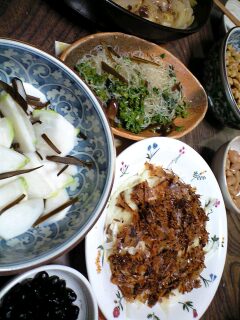 今日は会社の新年会だった。スーツに着替え、おめでとうを連発し社長の、こゆ時はワークシェアリングで100年に1度の不況も乗り越えましょう。上がり下がり、もしかしてそのうち100年に1度の好景気に転じるやも (人生ん十年、“100年に1度”に、2度も3度も転じればなぁ・・・・)(バブルもあったし、弾けたし、年々上がり下がりのスパンって早くなるからなぁ)あぁ、愛する息子たち。これから社会に出る息子たち。景気が少しでも上向きますよぅに。 “動けば”“動くだけ”労働報酬というお金になる。働くのが楽しい。お金を貰うのが楽しい。使うのが楽しい。(別に転がさなくてもよござんす)『あぁ、、そんな社会をーーーー。そんな好景気をぉぉ』(心の叫び)で、、、、、すました顔して今年もよろしくお願いしますだの。休みというのは早いもんですな。とか、明日からよろしくお願いしますだとか。正月休み明けはウエストがヤバいだの。夏より顔が皆さんむくんでますよね。だとか。うちは旦那の実家に3日間だから、それは大変でしたとか。ま、、新年会だった。新年会ではいただいたお歳暮とかお中元でビンゴをする(全員、持ち帰り分はもちろんある。一升瓶 欲しかったなぁ・・・)お酒をあまり所望されない方と袋の中の100%ジュースとビールを取り換えし営業の男の子からも、僕お酒呑まないですからどぞ。モロゾフとかゴディバとかのクッキーやらマカロンは全部わらしべ長者してきた(んで、全部 缶・・・大半ビールぅぅみゅぅ。残念。一升瓶にはならなかった。)で、こんなになった。どっしよっかなぁ。っと一瞬考えたけど、担いで帰る事にした。 ←歩きで来たから最初は両手にぶら下げていたが、思いの外 重いので途中から肩に担ぐ事にして、そのうち、袋の一つに穴まであいてきたので正月期待でふくらむ胸に(嘘、ふくらんだのはアルコールと炭水化物で腹)ころんころんたくさんのビールを抱えて帰る(紙袋で入れてくださればよかったものを。来年出るならズダ袋持って行こっと♪)新年三が日明け、スーツにブーツで、(スーツとコートはともかく、ヒールのあるブーツは少ししくった。と思った)昼日中、缶ビール山盛り抱えてえっちらほっちらにこにこ歩く。まるで、まるで、、まるで、、、あたし、布袋さんだわぁ♪戎さんだわぁぁぁぁぁぁ♪(エビスがたくさん入った、ゴミ袋抱えてるだけだろが。などとは、言わない。)ビール350ml ・・・16本ビール500ml ・・・・2本ジュース280ml ・・・6本 ジュース160ml ・・・7本見事担いで帰ってきた♪今年も正月から(無駄に)元気だ。◆豆・豆・豆昨夜のご飯おかんから貰ってきた韓国海苔がある♪(これはうみゃぃ)連れの今日のべんとも、韓国海苔の海苔段段なのだった。でっかぃなめこは 箸休めのなめこおろしにするんだども。ま、、2009年は3人の鍋からはじまる(ま、あたりまぇだなぁ。)ま、あいかーらずの鍋だけど、ひとつ屋根の家族の員数が減った。鍋も新調した。おとつぃの手羽先やタラの鍋の残りで、白湯うどんにするこった。連れもあたしも、ま、ちぃも、年末年始食傷ぎみでもある。年末に炊いた豆もある。まだけっこ余ってるんだども・・・黒豆は、醤油豆と、正月用に甘いのもあるしところで、おかんの黒豆は今年失敗してた。堅いでしょ?っと問われ、連れは即座に「うん♪堅すぎるね♪」と答えていた。今年はストーブと南部鉄鍋(と、年末 暇の量)で、貫目勝ちしたかな♪乾燥枝豆 秘伝豆●「秘伝豆」(ひでんまめ)は、夏は枝豆として、冬は「ひたし豆」として、 召し上がっていただける乾燥豆です。●青豆の種類に属し、山形県では「だだちゃ豆」に次いで人気の農産物です。●一晩水に浸して、20分茹でるだけ。茹でた後に塩をふっていただくと、 より一層おいしく召し上がれます。夏はビールのおつまみに最高!! ハマリますよ。こなぃだ店で見つけたので昨日戻して、さっきうでてみた。甘ぃぃ♪うんみゃ~~ぃ♪干してあるから、甘みとうま味が♪ うんみゃ~~~ぃ♪熱々を、ひたし豆もいんだけど塩でっ!!(周り見てても(洋酒好きはどっちかっつと、こってりが好きで(和酒好きはあっさり好みなよな気がすんのは、気のせぃか?今夜はおとつぃからストーブにかけてるスジコンと(牛スジと蒟蒻ですよ)やっぱ豆つまむのであった。ストーブは休みの間中、寒がりなあたしの暖房だけでなく日中ごろごろして放っとぃても、ほっくり炊きあがるそりゃぁ便利な強火の遠火のことこと調理器具として重宝したんだども。さぁ、明日からあたしも今年の仕事始めだ。。。。。。(ぅぅ・・ぅぅ・・・・・・・) ←忍び泣くなっ!!!今年もたくさん豆食べて、マメマメしく働こっと♪