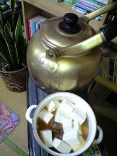 これ♪なぁぁぁぁぁんだ♪ そぉっす。 昨夜 皿で重石して水きりしておいた豆腐を (こりは、絹) 四分の一くらぃの厚さになったのかなぁ・・・ 豆腐の刺身っちゅ 「何で食べるぅ?」 「さびじょうゆ♪」(連れ) ままは、干がれいが食べたいの♪ ぱぱは、かますで ちぃは鯖ね♪昨夜の軟骨大根鍋の残り土鍋に、玉ねぎ4つ もやし1袋つっこんだ野菜スープを添えて召し上がれであるちぃは、豆腐の刺身がお気に入り高野が好きで、豆腐が好き。(秀も好きっすよ。あぃつはおまけに怒涛の納豆好き)ままの大豆好きは日々の生活で みゃくみゃくと受け継がれてゆくのであった。◆年賀状の当選 今日ぢゃなぃ?なんて連れが言うのでさっきぱそから打ち出した ちぃ調べとぃて 「Wii 欲しい」「まま、旅行券♪ぱぱと行くぅ♪」 ちぇぇ 4等切手シートだけかぁ んなもんですよね。。棚ぼたは夢見る割には割となぃ。 漢字の部首が割とおもしろぃので 秀に出した半分クイズを連れにもだす。 それはさぁ。。なんて系統づけよと無理やりする連れに 「系統はにゃぃっ!!理論もなぃ。。 合の部首は、ひとやねでなく、口なのだぁぁ 丸暗記しかなぃっちゅよ・・・・ とほほ・・・・」 今は居間で3人。 あたしは紅茶飲みながら 「まま、今夜は漢字書きたいから、まま使い終わったらちぃぱそ使う?」 「使う」 連れは珈琲飲みながら 煙草ふかして 「俺、明日のべんとの仕込みするよ」 いつもありまっと♪ 「あしたのべんと何がいぃ?」 「お任せ。昼休みに漢字書きたいから軽いのがいぃな♪」 ちぃは食後のデザート林檎を食べ終わって げっぷしながらクイズ見てげらげら 「来月資格月間だね♪(2万いくらが飛ぶざんす)」 日曜、夜8時半。 今夜も平和な我が家の夜。さ、、ちぃ交代 交代 場所替わろ♪