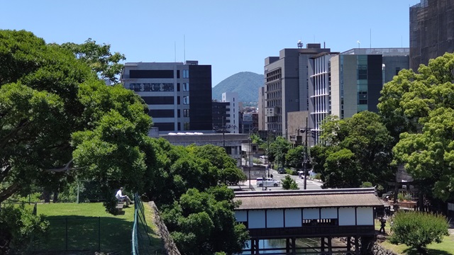 ビルの隙間から先ほどまでいた高崎山が見えてます