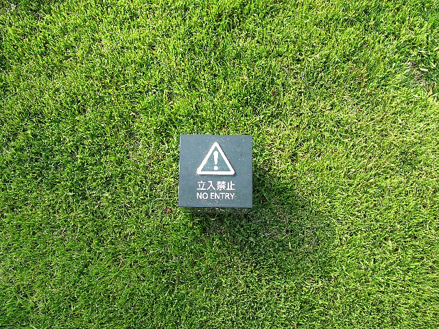 2008.03 東京ミッドタウン 芝生の標識 △ ! 「だれでもわかって」