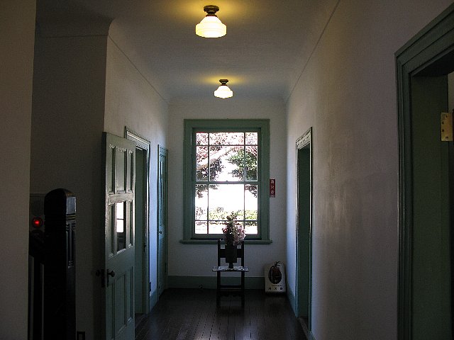 2008.01 ブラフ18番館 廊下のさきは窓 …この凛とした配置…古い椅子の上に花…好きです♪
