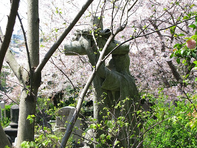 2008.04.06 外人墓地のマリア…外から(いつもの場所で) 何時もの場所…初老の男性カメラマン…一心にフェンスの隙間から撮影…「ここからのマリアさん好いですよね」と声をかけると「ウン」とうなずく…「今日は墓地の公開の日(有料大人200円)中からは撮りますか?」…「イヤイヤ」と首を横に…何故と目で…「ここから男の子桜をバックが好いんだ」と呟かれ…私は初めて中に入り…みてしまいました二人の像を…初老の男性の呟きが頭の中をよぎりました♪ 外人墓地 愛しの母子像 十字架の花輪にかかる右手が壊れて…残され悲しみをこらえる母と子の姿♪