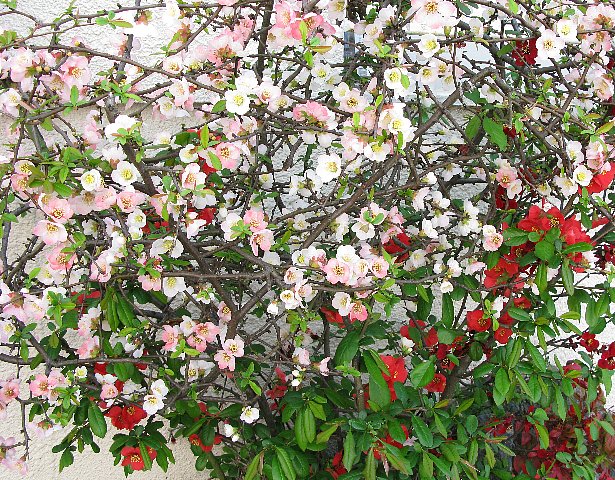 2008.04 散歩で木瓜の垣根 5年後に再訪問しよう♪ 好きな花の片手に入る「木瓜」…散歩で綺麗な”ぼけ”の生垣を見つけました…玄関のよこ壁面に沿って…白・ピンク・赤/緑のキャンパスに…木瓜に寒木瓜その感覚が素敵♪