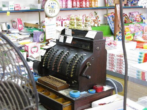 2008.03 水上温泉 「現役です」ナショナルレジスター…アメリカ製 この間訪れた水上温泉…石畳の商店街…老夫婦で営むみやげ物店…ハンドルをくるくる「ガシャ~ン」…購入金額が窓に表示されお金を入れる箱が出て…全てアナログ処理…夫妻と共に現役万歳ナショナルレジスター♪