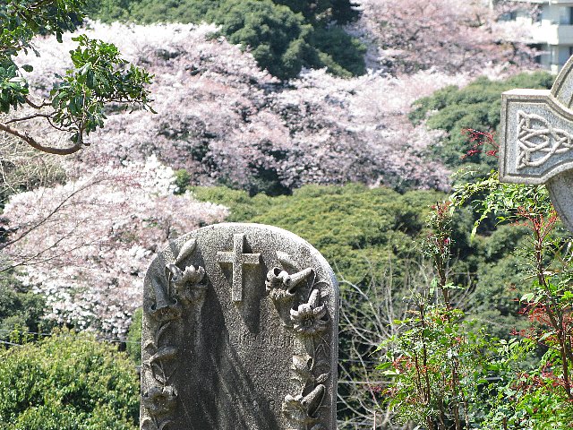 2008.04.06 外人墓地 墓標とさくら カサブランカに飾られた墓標とさくら…はるらしい山手の景色です…沢山の人々に見守られて…斜面の墓地…整備のための公開は…ボランティアの人々が支え♪
