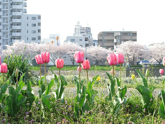 2008.04 チューリップとさくら 今日は久方振りに土曜日の出勤…一昨日頃から見ごろに…昨年も同じ構図で…今年は赤い色一色…通いの土手に紅白の幕♪