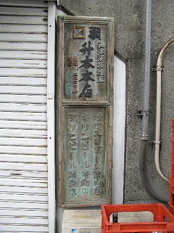 2008.03 新橋烏森口 看板 新橋の線路をはさんで左右…新旧…タウンと街…烏森ガード下の酒屋の看板…別の場所から此処に…木で造られた屋号…線路の向こうに未来の街が♪