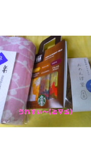 私の大好きな白雪布巾のてぬぐい、かりんとう、スタバのいろんな味が楽しめるコーヒースティック。