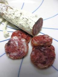 ちょっと珍しいものを食べたので記事にしておこうかと思います。白カビを用いた食品といいますと、カマンベール等のチーズが有名ですが、このようなサラミもあるんですね。写真のものは、「フエ・カセーロ・カタルーニャ」というスペインのサラミです。かなり歴史があるもののようで、1520年にカタルーニャ地方で発行された料理本には既にその名前が登場しているそうです。直径が普段サラミと聞いてイメージするそれよりは大分小さく、硬さもけっこうあって、白カビでよく熟成したんだなぁという印象です。ちなみに、食べる時はこの白カビをはがして食べます。皮をむくように簡単にむけますよ。結構気持ちよかったり^^味わいも、ややチーズを思わせるようなミルキーな雰囲気や、熟成した風味があります。また、脂の美味しさはもちろん、肉の赤身としての美味しさもしっかりあり(ワインとあわせると鉄分を感じられます)、ちょっといいサラミを食べた気分にしてくれます♪カタルーニャのタパスでも人気なようです。スペインの加工肉といいますと、ハモンイベリコが圧倒的に有名ではありますが、サラミもなかなか面白いです。楽天内でも取扱いがあります。価格も1000円しません。イベリコのものもありますが、こちらは1470円とちょっとだけ値段が上です。といっても、ハモンイベリコよりはお手ごろかもしれません。国産のものもありますね。佐渡島のへんじんもっこが作っています。ぜひ一度試したいものです。