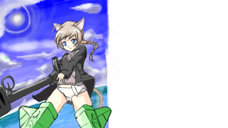 えっとさ、皆分かってると思うけどまぁ一応ね。一個下の記事の絵だけど、履いてるのはパンツじゃないですよ?「軍人であるため、普段から軍服を着ているが、ストライカーを装備する必要上から上着のみを着用する。腰の部分には「パンツのように見えるもの」を穿き、脚部は素足か、スパッツ・ニーソックス・タイツ・ストッキングなどを履いている。」(ウィキペディアより抜粋)そんな感じのものですから。勘違いしないようによろしくb