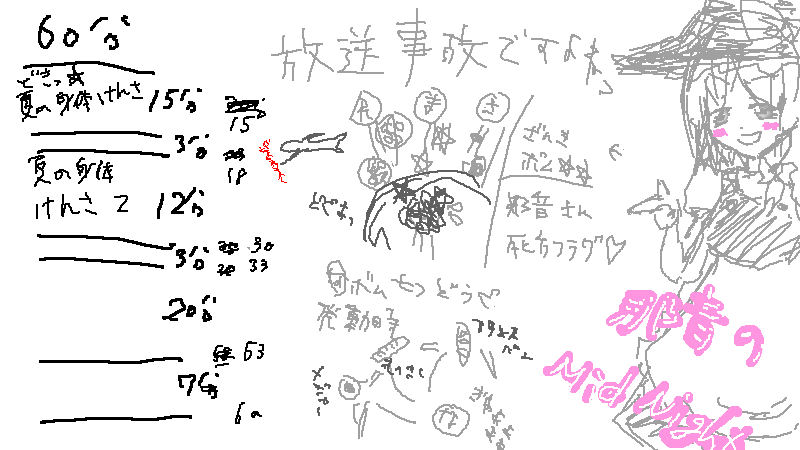 今日は一日、美術に使ったので明日は頑張って勉強します。あと漫画の方も描きます。えーページ的には本編は30ページになる予定。漫画は基本的に4の倍数ページになるようにね。1 表紙2 真白3 あいさつ4 漫画本編1p5~33 本編2P~30P34 あとがき&おくづけ35 真白36 裏表紙予定。とりあえずストーリーは作ったからネーム制作中。そんな感じでたんたんと過ごしている学調前のぽっちゃでした。ねろらじで、この前やってたやつがものすごく面白かったあのね、「SOS団がだべる」みたいな感じだったんだけど声が似てる人たちでとりあえず5人そろってたのかな?ほんとに似てたからすげぇって思った。また聞けたらいいなぁ。ってかその声の似てる人たち5人がそろってるってのがすごいと思ったwねとらじ