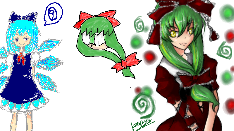 1時まで粘った結果鯖回復しましたぁので雛を完成させました。ちなみにこの雛、「どっかで見た事が...」って人がいるかもしまどりるさんの絵を見ながら描いたからです最初はそのまんま描こうと思ってたんだけどもあの独特な描画方法【主に着色】は再現出来そうに無かったので構図はそのままで塗り方は自分流になりました。そのせいで影はめちゃくちゃだけどもwあと、SSの残していった【多分】雛【ソニック風】を完成させた勝手にwwSS>ごめんノってことでうpキャプ出来なかったと思うから持ち帰ってくださいましチルノ【左】...那音 【多分】雛【ソニック風】【中央】...S.S 鍵山 雛【右】...ぽっちゃ