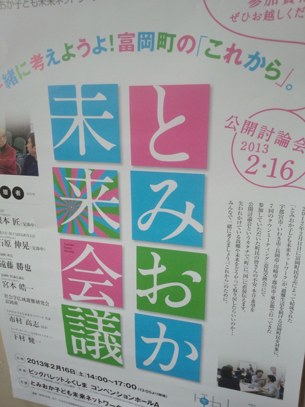 今週16日に郡山ビックパレットで「とみおか未来会議」が開催される。いよいよ!という感じで感慨深いものがある。平成23年の初秋、震災・原発事故から半年経った頃、発起人の4人がいわきの居酒屋で初めて顔を合わせた時の事を思い出す。「どうなってんだ!?何でこんな事態になってんだろう!?」「俺たち突然町から追い出されて、どうして誰も何も説明してくれないんだ!?」「町民無視で全ての物事が決められていく!」「どうして俺たちの声は全く聞き入れられないんだ?」 避難を強いられた身で「絶対おかしいよな」という共通の思いをぶつけ合った。「俺たちの町のこと、俺たちの将来のこと、俺たちの人生のことは俺たちが創っていかなければならない。」「突然町を追い出され、突然生活を壊され、人生を狂わされてしまった。そのうえ未来までも奪われるなんてまっぴらごめんだ。」「なかなか理解してもらえない。うちらの状況はうちらにしか分からないのかもしれない。」「だったらうちら自身が声を上げなければ。そして避難している町民の本当の声を届けよう。」そんな思いはずっと一貫して持ち続けてきた。私もここで支援者という立場で携わっているつもりはない。避難を強いられている当事者として、町民による町民のための草の根運動が大切なんだと思う。あれから1年以上、全国各地で避難している同じ富岡町民とタウンミーティングを続けてきた。たくさんの方とつながり、避難生活の苦悩を吐露しながら、一緒に町の将来、自分たちの将来を話し合ってきた。たくさんの支援者とつながり、応援、サポートをしていただきながら紆余曲折やってきた。たくさんの出会いがあった。失敗と挫折の繰り返しだった。「そんな事して何になんだい?そんな事言ったってしょうがねぇべ。変えられるわげねぇべ。」という意見と自分の弱さと葛藤しながら、それでも、「変えられないかもしれない。けれど何もしなければ絶対に変わることはない。町民一人一人の力は小さいけれど、束ねればそれは大きな力になる。勝てないまでも一矢報いたい。」と思いながらやってきた。その集大成として今週末の「とみおか未来会議」がある。タウンミーティングで出た多くの住民の声を、社会学者の協力のもとで整理、集約し、それを町や国に公開討論の場で届けるという試みだ。当日はマスコミも多数駆けつける。多くの富岡町に思いをはせる方達にぜひぜひご参集いただきたい。集まれ富岡町民!!勝てないまでも一矢報いたい。