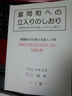 本日3月25日午前0時、我が富岡町が区域再編された。11市町村中8番目だそうだが今までの市町村とは規模が違う。富岡町は3分割され、町の29%が帰宅困難区域、62%が居住制限区域、残り9%が避難指示解除準備区域となった。居住制限区域だけで約4000世帯もあるという晴れて富岡町の大部分が今日から自由に出入りできるようになったわけだ。 町民には事前に町役場から「立入り証」と「立入りのしおり」が配布されている。「立入り証」は自由に入れるようになったものの、警察に職務質問された時に簡単に身分を証明するために提示するものだという。 「立入りのしおり」を読むと、一番最初のページには「立入りの際にはタイベックスーツ、マスク、手袋等の防護装備を着用してください。」と赤く大きな文字で記載されており、線量の高い所もあるとの注意書きがある。立入りには線量計を持ち歩き、ノートに被曝線量を記録し、帰る時にはスクリーニングを受けるようにとも書かれている。これを読んだだけで、決して安全になったから警戒区域が解除された訳ではないことが分かる。読み進める毎に腹立たしくなっていくのは私だけだろうか。何のために警戒区域を解除して区域再編して立入れるようにしたのか。危険だけど、自己責任でどうぞという内容に感じる。そしてそのしおりには、国の方針に町は従わざるを得なかったと町長のメッセージまでが綴られている。その他電気、ガス、水道も使えません。トイレも使えません。ゴミも出せませんと記載されている。本当何のための解除なんだろう?考える度腹立たしくなってくる。 この区域再編は政府が早く事態を収束させたい、被害の実体を早く封じ込めたいだけのような気がする。町民のための区域再編ではない。我々住民の安全や健康などは二の次なのだろう。全く愚弄されている。安全性に関する裏打ちのないまま、町民無視で警戒区域を解除して区域再編して、事故の幕引きを図ろうという風にしか感じられない。 富岡町は町の方針として5年間帰還しないことを決めているので、区域再編してどの区域になろうが5年は誰も住めないし帰れないのだ。区域再編の意味がないのだ。除染やインフラ整備なんてやる気になれば区域再編なんてしなくてもできるはずだ。そしてこの区域再編によって賠償額に大きな差が生じて住民間の分断も生じさせている。多くの町民の思いとは裏腹に、帰れることが前提なので賠償額も低く押さえ込まれている。 この区域再編は帰還するための、またその準備のための区域再編ではない。町民にとって全く前進した感はない。メリットといえば面倒な立入りのための手続きが無くなっただけ。あとは賠償額の減額、賠償打ち切りのカウントダウン、地域の分断、住民の分断、健康被害のリスク、とデメリットしか見当たらないのではないか? 私自身もう1年以上家にも実家にも行っていないので、今年は防護服を着て両親を連れて立入りしようと思っている。防護服を着て荒れた大地と朽ち果てた我が家をみて自分自身に印籠を渡すための、諦めをつけるための立ち入りになるのではないか。