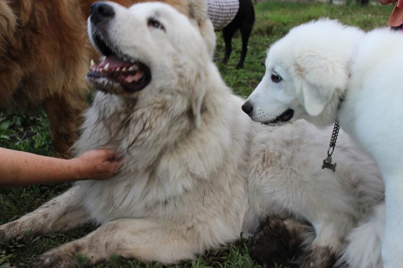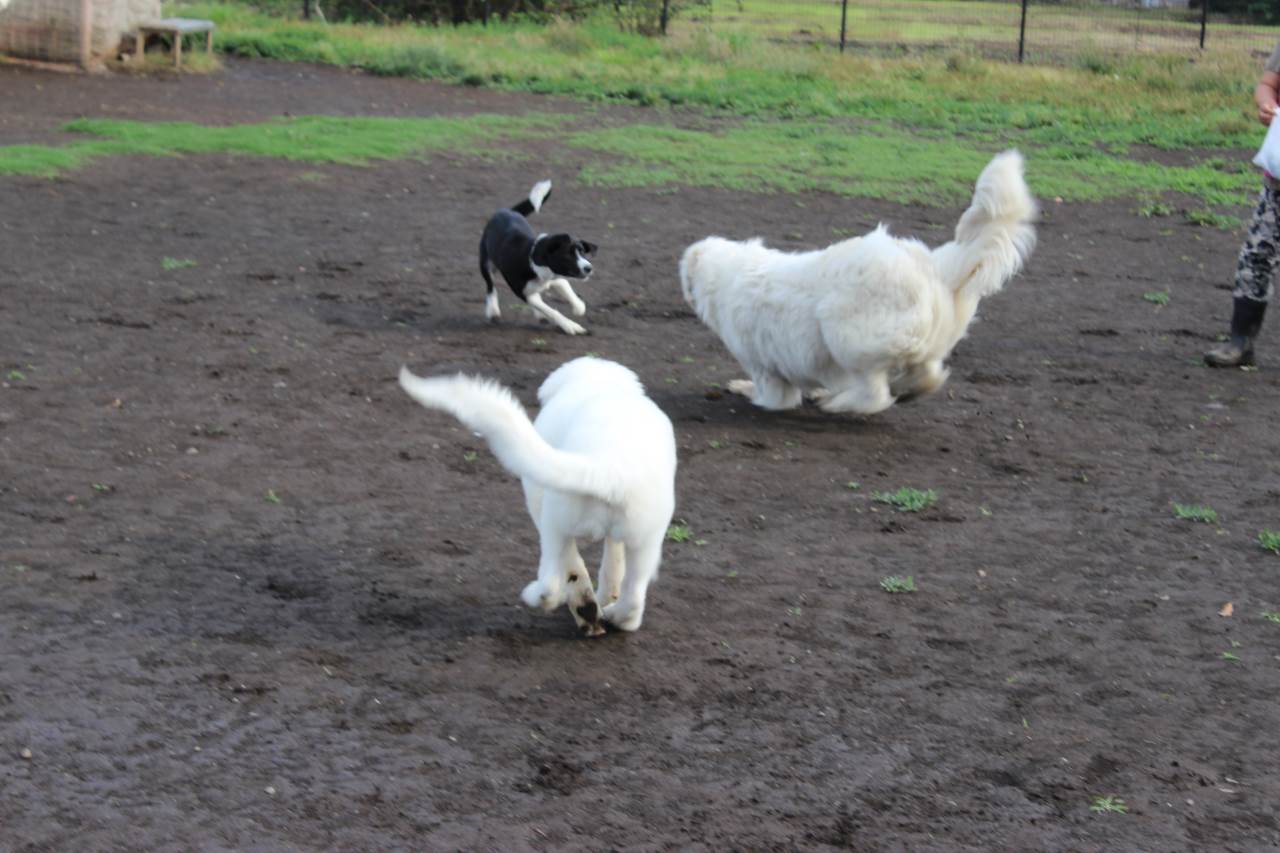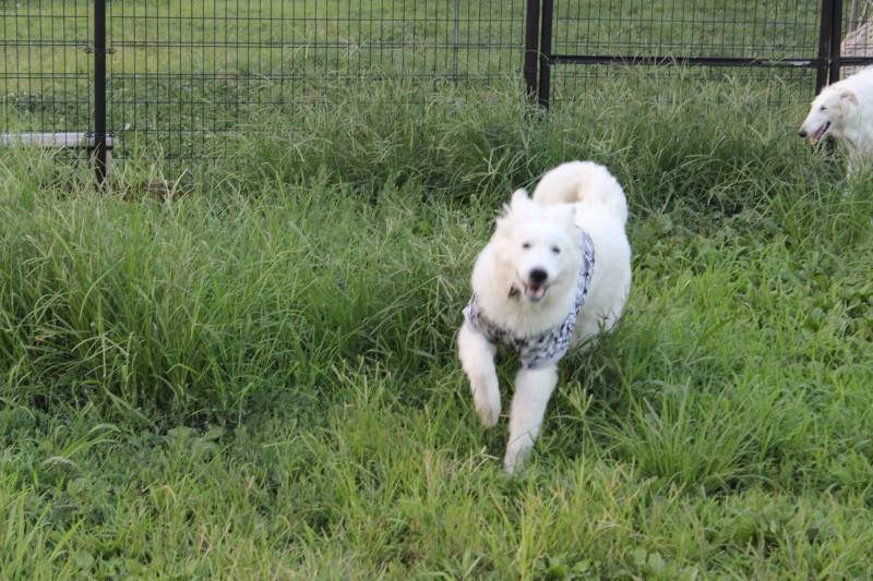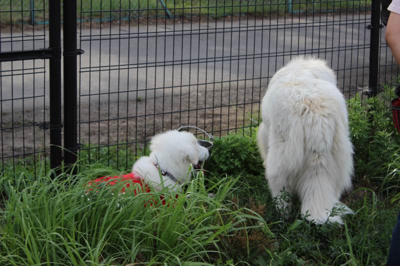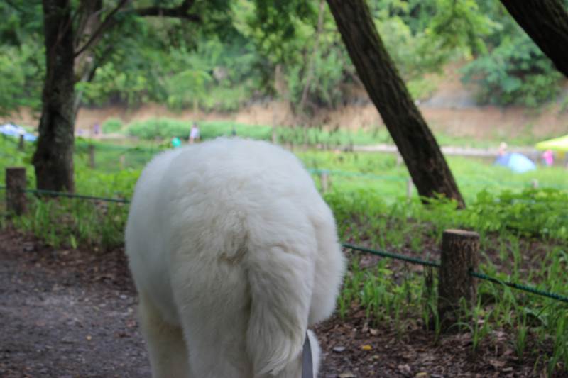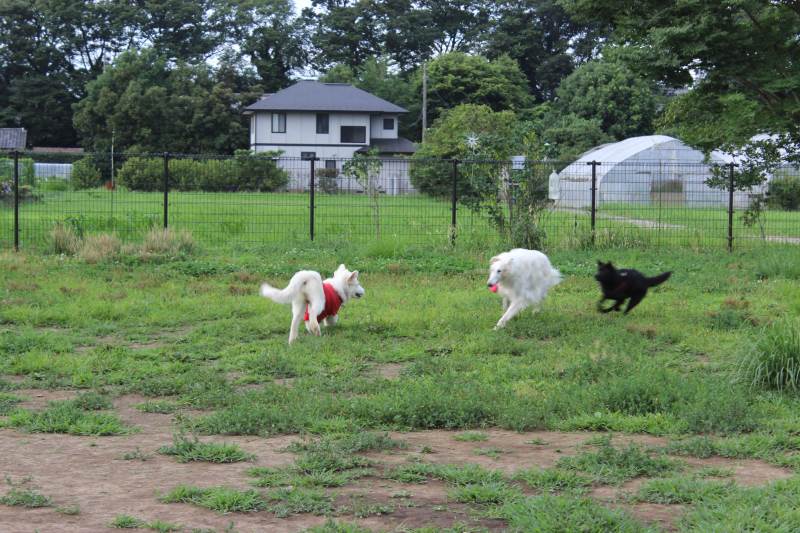 グレートピレニーズは、暑さに弱いので遅い時間にドッグランに連れて行ってもあまりスイッチが入ら無かったのですが、なぜかドッグランの暴走特急のボルゾイくんに一番遅いぶらんが突進していきました。あまり相手にしてもらえなかったのですが、ぶらんは満足そうです。