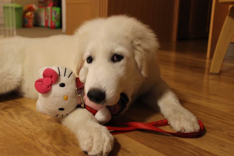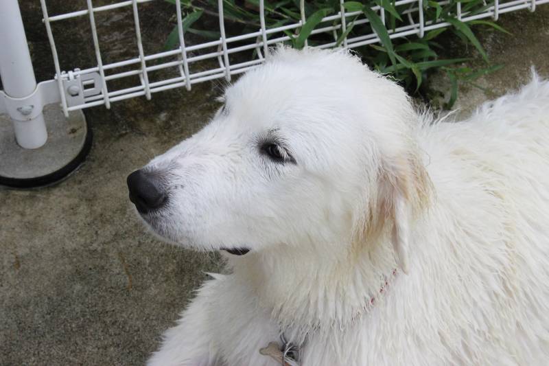 今日はパピートレーニング最終日です。思えばもう10回。2ヶ月半前(生後2.5か月)に始めたときは、傷だらけで格闘していましたが、今はほとんど強くは噛んできません。まだ、赤ちゃんなので甘噛みはしますが。さて、今日の最初のトレーニングは耳の掃除です。大型犬ならではの豪快な方法を教えていただきました。また、肛門絞りも教えていただきましたが、大型犬なのでほとんど出てきませんでしたし、匂いもそんなに臭くなかったです。続けてトレーニングも考えておりましたが、グレートピレニーズの特徴である厚い毛が猛暑に耐えられないので、次にトレーニングを行うとしたら10月から始めた方がよいとの事でした。あと3ヶ月、少しずつしつけて行こうと思います。また、先生から合格の御言葉をいただきました。最初に連絡したときに、最初からグレートピレニーズなんてチャレンジャーですね。と言われていたので落ちこぼれないよう一生懸命がんばりました。そのおかげで、ぶらんは成長しました。忘備録代わりに今できる事を書き綴りたいと思います。トイレ △時々失敗:原因成長するスピードが速いのと、フロアマットを噛みちぎったせいで、ケージとサークルのレイアウトを何回も変更しました。これでだいぶ戸惑っているのかも。一からしつけ直しです。すわれ 〇おやつをほしがるときは100%成功します。リードを付けいているときは抵抗する場合があります。すわれ-待て 〇 おやつがあれば20m先でも待っています。隠れたり、他人がちょっかいをかけると動いてしまう事も。伏せ 〇リードを付けいているときは抵抗することもあります。伏せ-待て 〇すわれ-待てと同じです。お手 〇おやつがあればできます。おかわり 〇おやつがあればできます。ハイタッチ(右前足高く) 〇おやつがあればできます。ぶらんちゃん(左前足高く) 〇おいで △ゆっくりですが戻ってきます。遊びに夢中だとまだ無理です。付いて △おやつを鼻先に持って行けば付いてきます。散歩中はリーダーの顔を見ないときも有ります。後へ △おやつで誘導はできます。止まれ △歩行中に車が来たときや横断歩道で待つ時にスルー △道に落ちている口に入りそうな物を通り過ごせます。お顔 〇首輪を付けるときに首を差し出すようにしてます放せ △咥えている物を放させます。持て ×やった事有りません。今度やってみます。ごろん △おやつを見せればやります。だめ △言う事を利かない事もあります。◎ 言うことを聞く〇 まあまあ聞く△ 半々× できない(やったことがない)