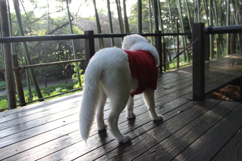 昨晩の雷雨で、ドッグランがびちゃびちゃだったので、近くを散歩しました。良い雰囲気の竹藪がありました。木漏れ日がきれいでした。