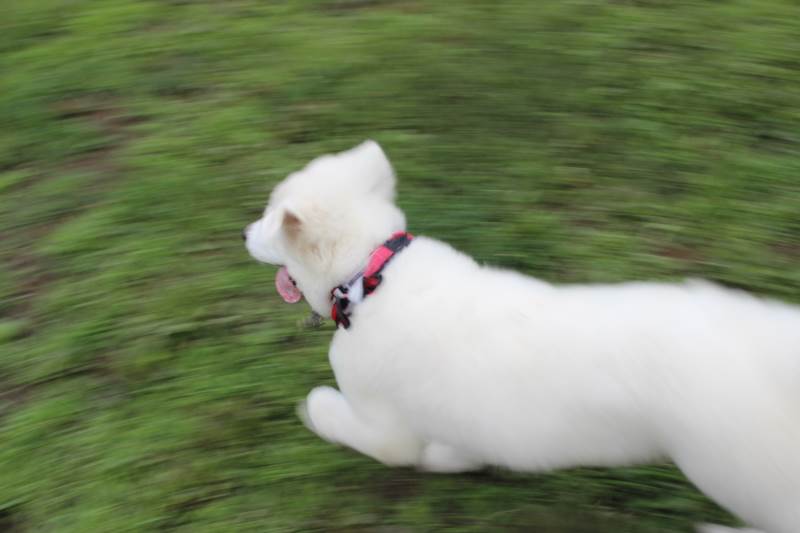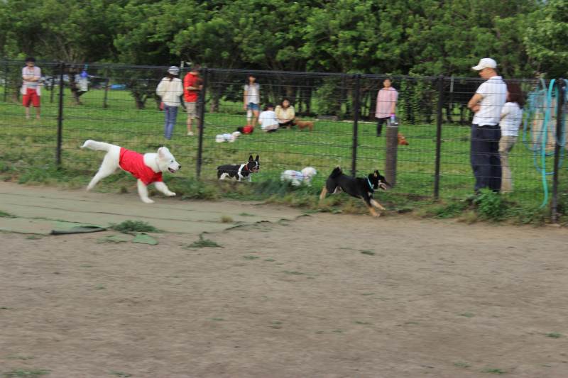 今日は、ブランにとって生まれてこんなに体力使ったことないというぐらい動きました。そして今日の最後は、おなじみドッグランです。いった時間帯が早かったせいか、ぶらんより小さいわんちゃんばかりでした。時間が経つにつれ大型犬が集まり始め、みんなと挨拶することができました。何のスイッチが入ったかわかりませんが、突然黒柴ちゃんと走り回りました。しかし、ぶらんはドッグラン一の鈍足です。足の速さでは、かなうはずはありません。ずるがしこく、最短距離で向かうか待ち伏せしていました。黒柴ちゃん遊んでくれてありがとうございました。