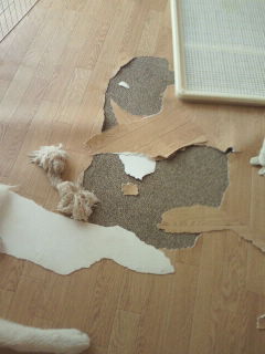 サークルの下に敷いている、マットに穴を開けました。これで、五枚目です。家具などはほとんど噛りませんが、サークルのマットは噛ったり穴を掘ったり破きまくりです。先日マットがよれていたので、それを手がかりに破いた感じです。マット貧乏になりそうです。