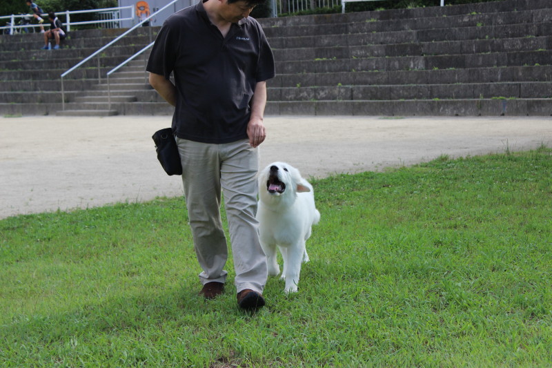 今日は朝からパピートレーニングです。今まで、歩くたびにクンクンと嗅ぎまわって散歩していましたが、今日のトレーニングは強制的にウォーキングです。いつもと違う散歩に戸惑っていましたが、後半にはリーダに多少合わせ歩くことができました。まだ、リードを持っている方は、常に引っ張っている状態です。ぶらんは引っ張ると動かなくなりので大変です。リーダーウオークの始まりです。超大型になってからのしつけはでは遅いので、今からがんばります。トレーニングを受けると、リードの持ち方・長さ・体重のかけ方まで教えてもらえます。いかに犬の気持ちをリーダーに向けるかを考えながらの散歩なのでこちらも疲れます。