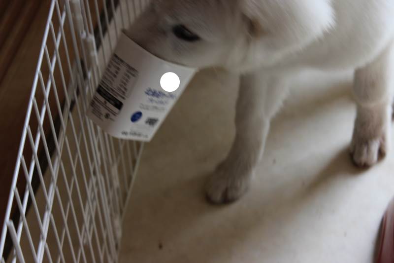 体が大きくなってきたので、水飲み用のバケツを買いました。ドッグランのフェンスにも引っかけられます。でも、帰宅してビックリ。床が水びだしです。