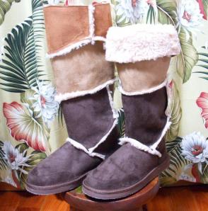 9/19にミングルさんで共同購入したパッチワーク2WAYロングムートンブーツ、やっとさっき届きました~注文からちょうど2ヵ月、だいぶ待ったなぁ。本当はベージュLが欲しかったけど、共同購入のページを覗いた時にはちょうどベージュLだけが売り切れてて、迷いに迷った結果、ブラウンLを購入。3色のパッチワーク、凄い気に入った!見た目はかなり好み左はそのまま伸ばした状態。右は上部を折ってボア見せ状態ね。気に入ったけど、1980円というお値段なりの部分もあり^^;というのはボアがね、よ~く抜けるんだわ。これ^^;中のボアもポロポロ、パッチワーク継ぎ目のボアもフワフワとよく抜ける。ソールは結構滑りにくそうな感じで、ブーツの縁などもキチンとパイピングされていて擦り切れたりし難そうで、割と丈夫そうかなと思う。ただ、思ったよりもブーツの筒が細いのよね。「横から見ると、お腹にた~っぷり卵を抱えた鮭のようなふくらはぎ」と呼ばれた太足で(ハイハイあまりに絶妙過ぎて、もう何も言い返せなーい orz)素足で試し履きしたところ・・・この太い素足で結構ピッタリでしたあうあう。ちょっと、スキニージーンズをインして履くのは、かなりキツそうな予感うーん、タイツかデニレギでなら何とか履けるかな?素材そのものは、お値段なりという感じだけど、この価格だから問題無しです。ボアがよく抜けるのも、想定内という範囲だし・・・・・さて・・・問題は、まだ20℃台の沖縄で、いつこれを履こうかね?ということだけだな