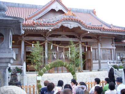 行って来たのは昨日なんだけどね^^先日、普天満宮にお参りに行った時に案内を見て、事前に申し込んでました♪~~~~~~~~~~~~~~~~~~~~~~~~~~~~~~~~~~~『夏越の大祓』大祓とは、日々の生活の中で気付かぬ内に心身についた罪穢を祓い清めて無病息災を祈る大切な神事です(案内から引用)。一、大祓式一、茅の輪神事一、洞窟くぐり・・・という流れで行われるとのこと。こういうのって、この時期に日本じゅうの神社でやってる?( ̄ω ̄?)例えば、実家の千葉にある千葉神社とかでも、『夏越の大祓』ってやってるしな。で、夕方から、宜野湾市の普天間にある「普天満宮」へ。これは大祓が始まる前。境内を取り囲むように、パイプ椅子がい~~~~~っぱい並べられ、それぞれ着席。後ろのほうで立っている人もいっぱいいる、そんな満員御礼状態。穏やかな声の神主さん?宮司さん?から開始前の説明が一通りあった後、大祓式から始まります。何をやってるのか?は、私も分からんのだけど何かを読み上げたりとか白いさらし風の布を、手で何度も引き裂いたりとか^^;これは、立っている神主さん2人のうち左側の神主さんが布を持ち、右側の神主さんが、布を手で引き裂いてるところ。この後だったかな?順番が前後してるかもだけど、「頭をお下げ下さい」の呼びかけの後私達参加者が頭を下げて(これが結構長かった)、お祓いをして頂きました。そのお祓いで、神主さんが境内のところから振っていたのがどうやら、何本も束ねたガジュマルの枝(葉もいっぱい付いてるよ)だったらしい。こういう神事の時に用いるのって、榊のイメージなんだけど沖縄ではガジュマルなのか?^^;内地だと榊?よく分からんw更にこの後、会場にいる人達全員に配られたのが、白い紙を三角に折った袋。神主さんからの合図で、その白い三角の袋を開くと・・・袋状になっている中に、半紙風の紙吹雪&短い藁状のものが入ってる。これは、自分でその紙吹雪を使ってまずは、紙吹雪を自分の左肩に散らして、次は右肩に紙吹雪を散らす。こうして、セルフでお祓い・お清めをするアイテムだった^^;このお祓いを、会場に集まった人達が全員でやるんだから境内の周りじゅう、あっちゅー間に白い紙吹雪だらけ。どこの祝勝会会場だよ?ってささて、これが終わると、次に執り行うのは茅輪神事。1番上の画像の中央にある茅の輪を参加者1人1人が、8の字にくぐります。長くなるから分けるわ~。